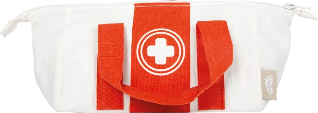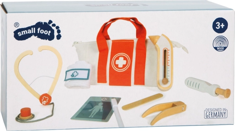 Stetoskop, termometer med skydeindikator, sprøjte, pincet og spatel – sikre, glatte og behagelige i en barnehånd, styrker finmotorikken.