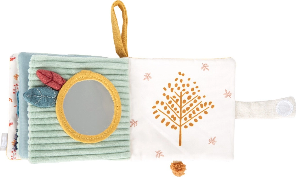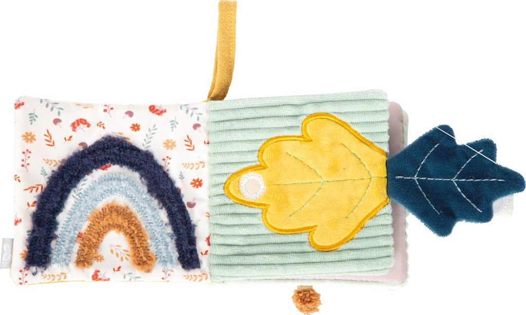 Hver side giver en ny oplevelse – knitrepaneler, stof-faner, bløde plyselementer og en integreret rangle til lydlige stimuli.