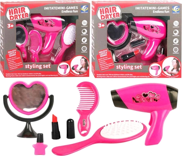 Opdag frisørsættet med hårtørrer, som vil glæde enhver lille elsker af frisurer. Legetøjet er designet til børnehænder, støtter fantasien og udviklingen af finmotorik. Der er 2 varianter: med lille spejl, kam og børste, eller med spejl, læbestift og flaske. Prisen er for 1 stk.