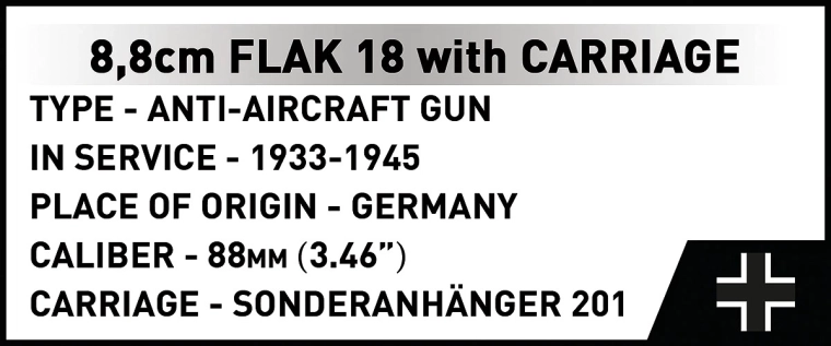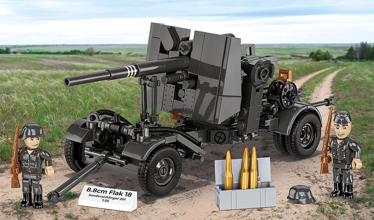 Denne klassiske version af den berømte 8,8 cm FLAK 18 leverer en autentisk model med gennemarbejdede detaljer og funktioner til både display og leg. Takket være krydsaffutagen kan modellen hurtigt drejes 360° og sigte realistisk, hvilket fremhæver den tekniske elegance ved dette historiske ikon fra Anden Verdenskrig.