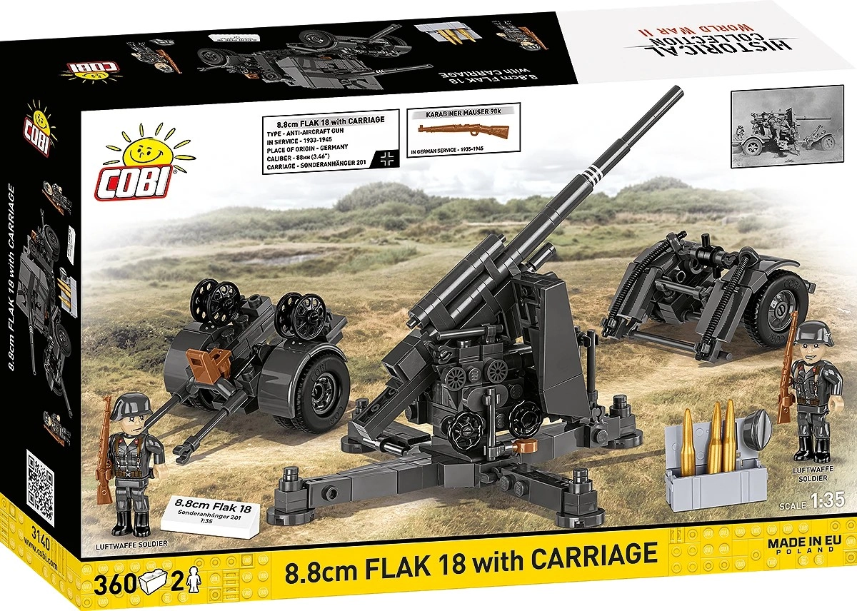 Byg den legendariske tyske kanon 8,8 cm FLAK 18 med detaljeret vogn og tilbehør. Sættet med 360 klodser byder på realistisk udførelse, justerbar elevation og stabilt krydsstativ – ideelt til samlere, historieentusiaster og byggesætsfans.