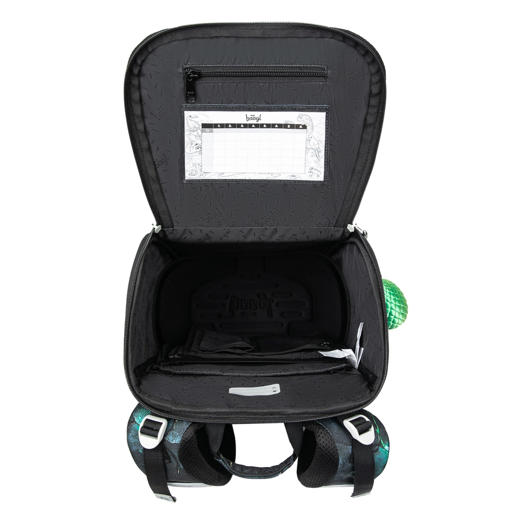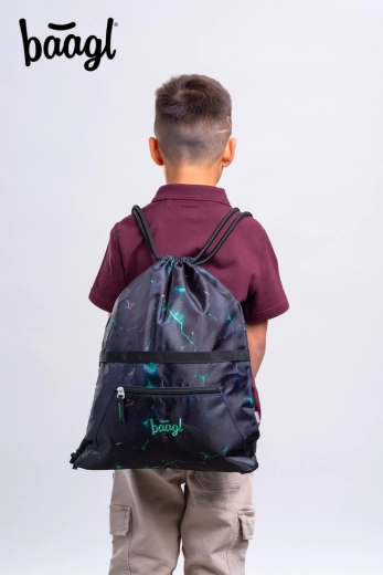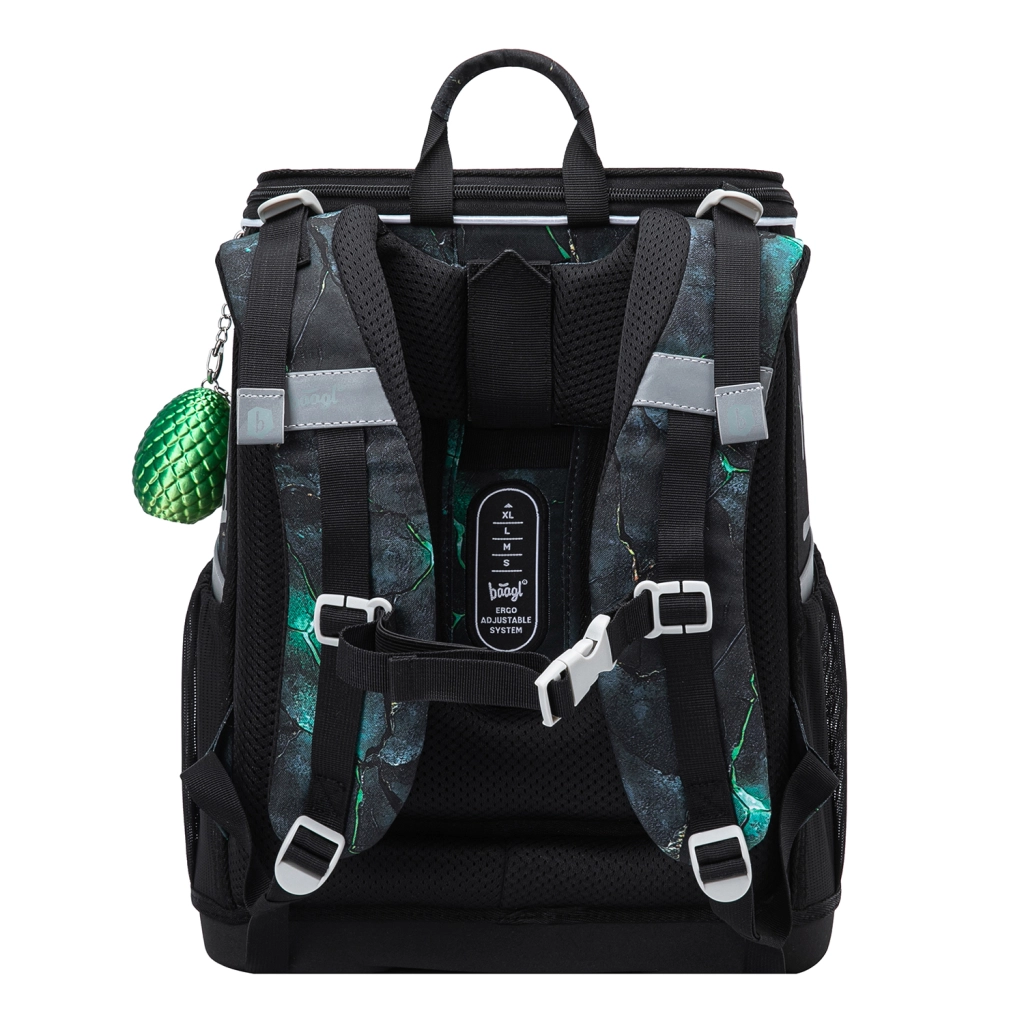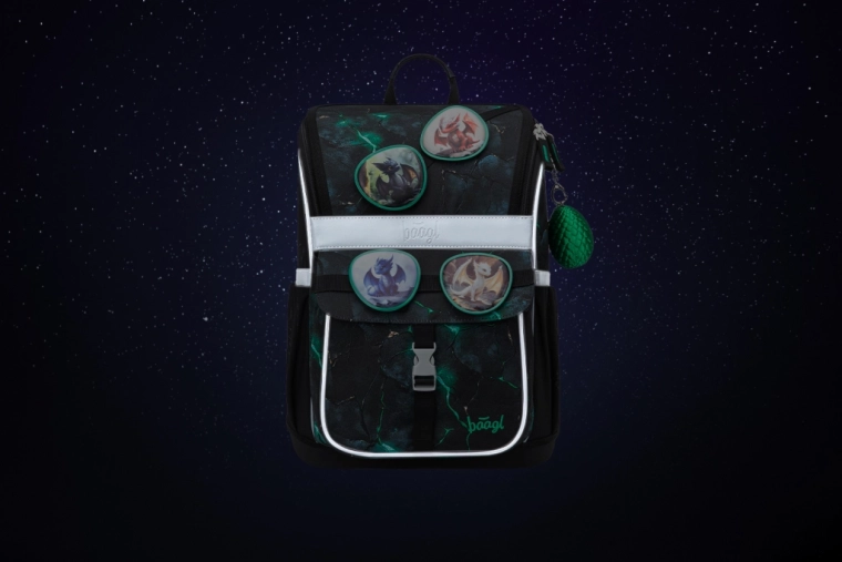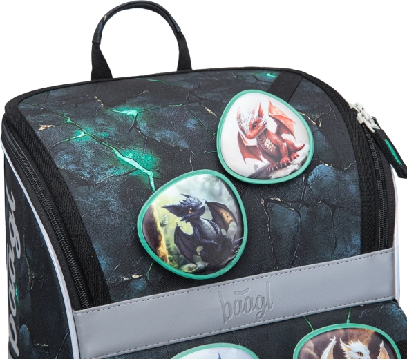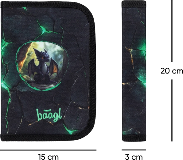 Komplet skolesæt til førsteklasseselever og yngre skolebørn med dragemotiv: ergonomisk BAAGL Zippy skoletaske med justerbart bæresystem, rumligt penalhus og let sportspose. Tilbyder sikkerhedsreflekser, kvalitetslynlåse fra YKK, robuste og vandafvisende materialer samt smart inddeling for overskuelig opbevaring af både skoleartikler og sportsudstyr.