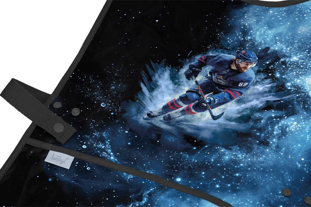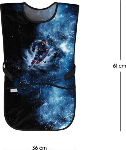 Stilfuldt børneforklæde med hockeymotiv, ideelt til både skole og fritid. Takket være det holdbare og aftørringsvenlige materiale er det let at holde rent og beskytter tøjet mod maling, lim og små urenheder.
