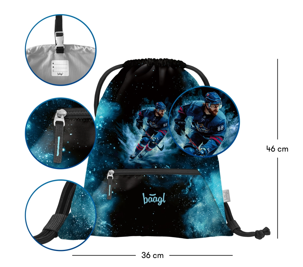 Let og robust BAAGL-pose med HOCKEY-motiv er et glimrende valg til skolebørn og aktive børn. Der er plads til skiftesko, sportsudstyr og ting til fritiden. Takket være lynlåslommen har du småtingene altid ved hånden og pænt organiseret.