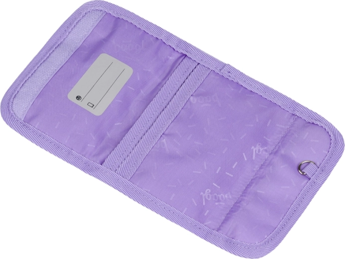 Den praktiske inddeling omfatter lukning med velcro, separat lynlåslomme til mønter og indvendig organisering til småting, kantinechip eller nøgler. Indvendigt er der et navnemærke for nem identifikation og en ring til fastgørelse af nøgler eller karabinhage.