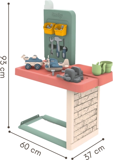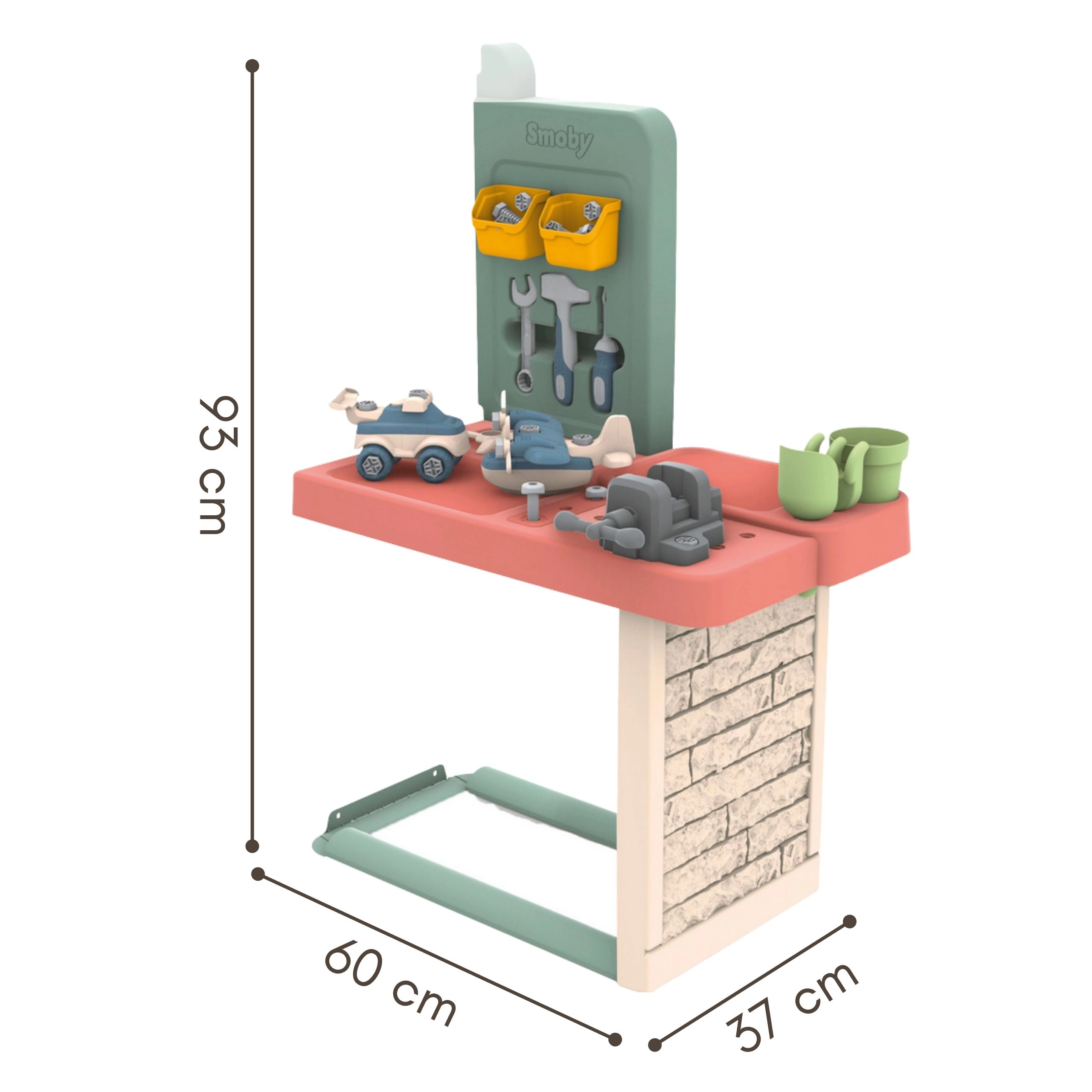 Dette sidebord til værksted er det ideelle tilbehør til SMOBY Life legehuse. Takket være gennemtænkt organisering og et rigt udvalg af værktøj kan børn sikkert udforske gør‑det‑selv‑verdenen og udvikle finmotorik, koordination og logisk tænkning. Den brede arbejdsflade og opbevaringshylder holder alting på plads, så legen bliver overskuelig og sjov.