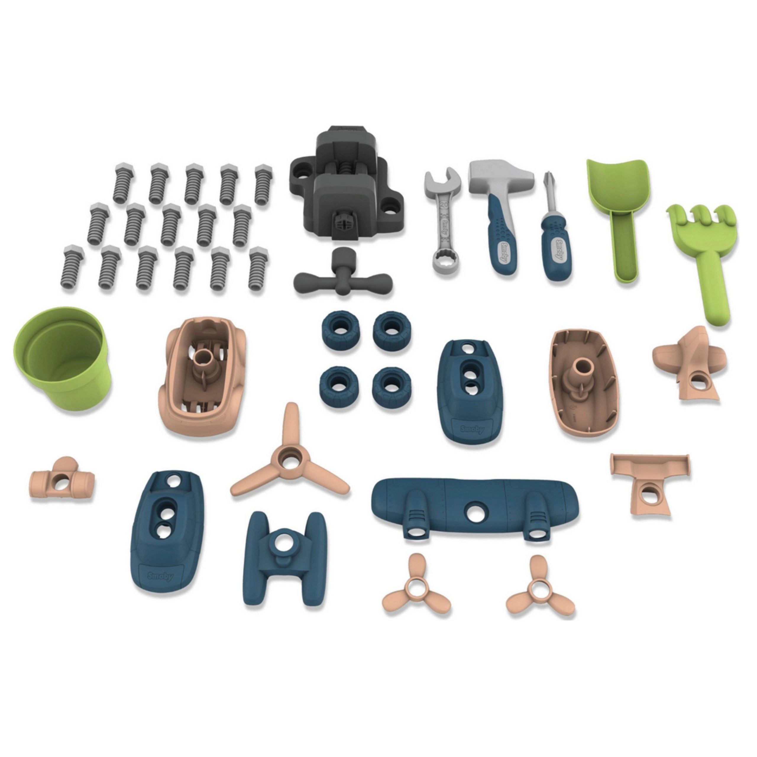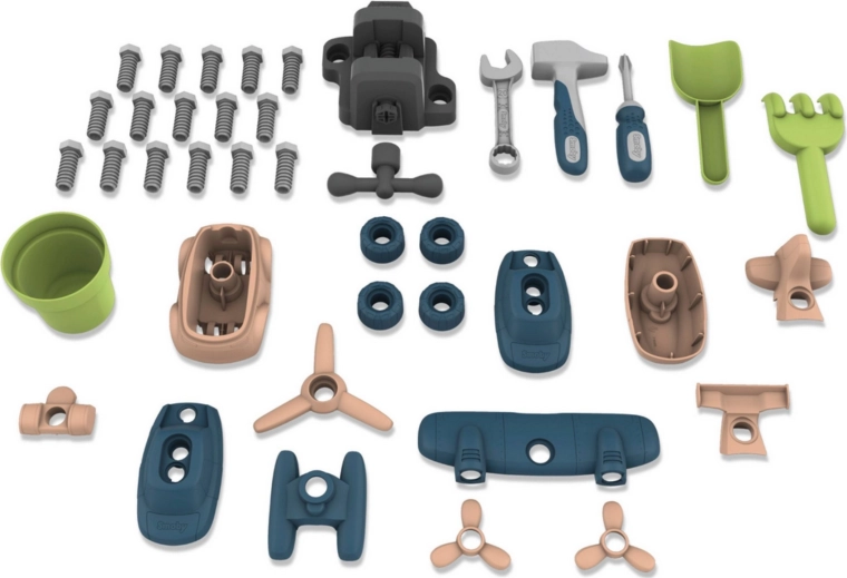 Der medfølger 39 dele, inklusive hammer, skruetrækker, nøgler og befæstelser. Børn kan selv samle en bil og en helikopter, hvilket træner tålmodighed, præcision og giver en følelse af succes. Materialet er robust, UV‑stabilt og indeholder en høj andel genbrug – perfekt til langvarig brug i haven og indendørs.