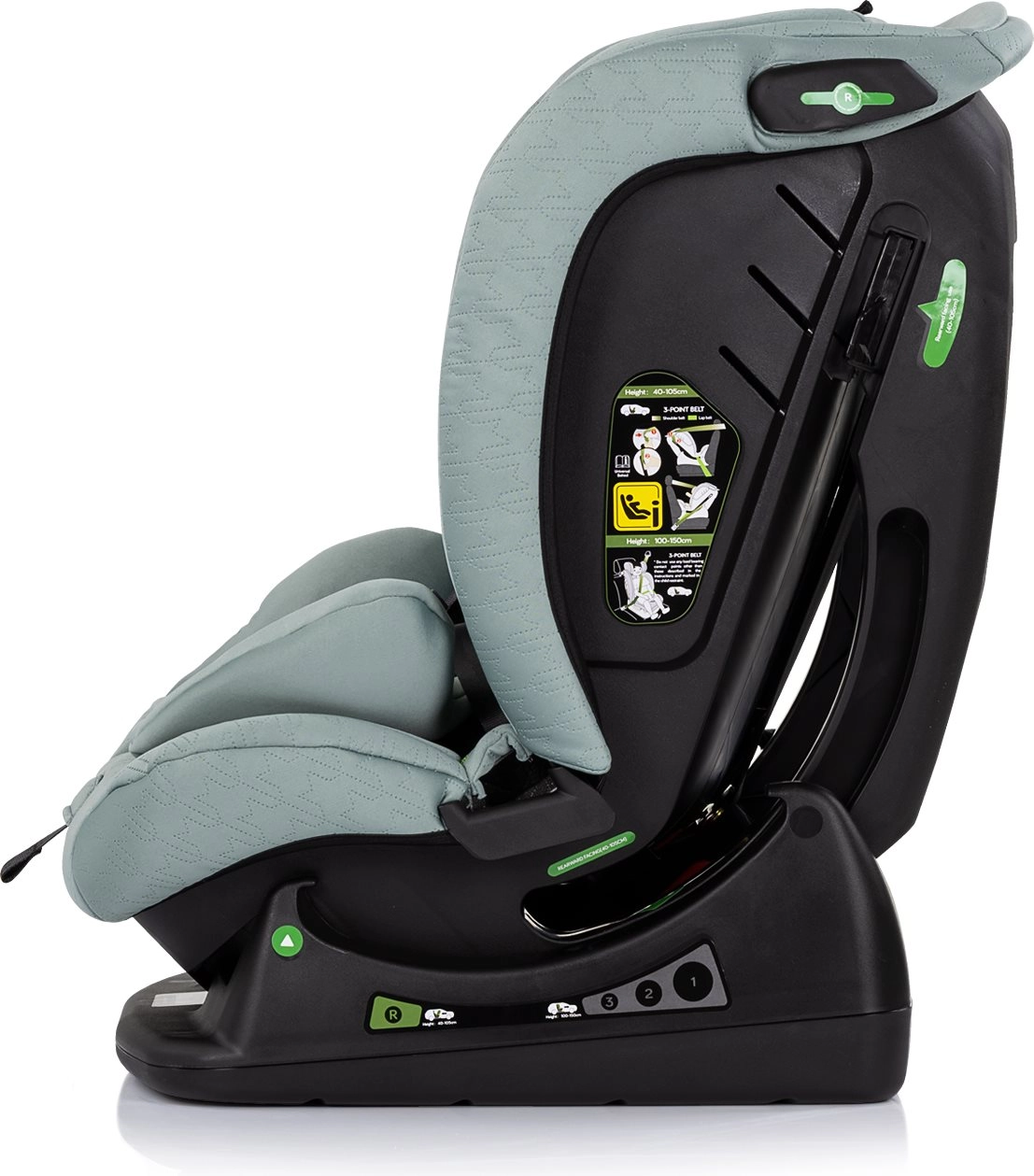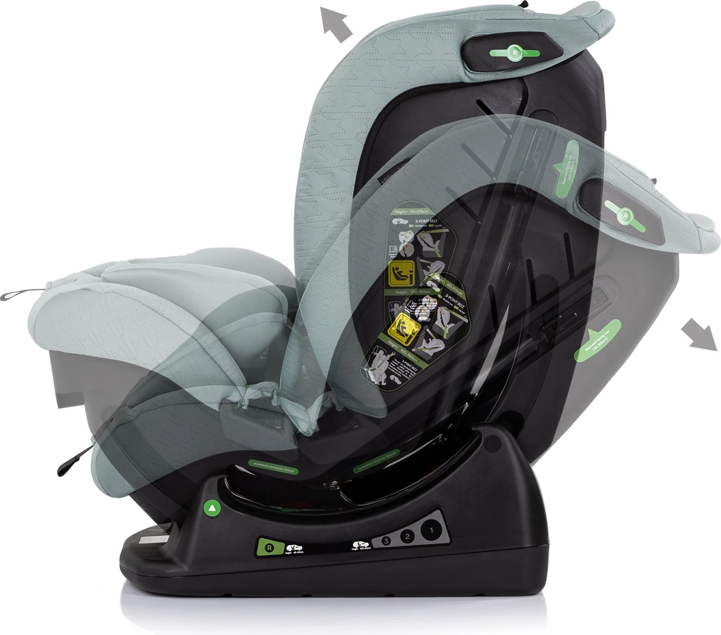 Justerbar hovedstøtte og længdejusterbar 5-punktssele med bløde skulderpuder sikrer perfekt pasform og sikker fastspænding i alle aldre.