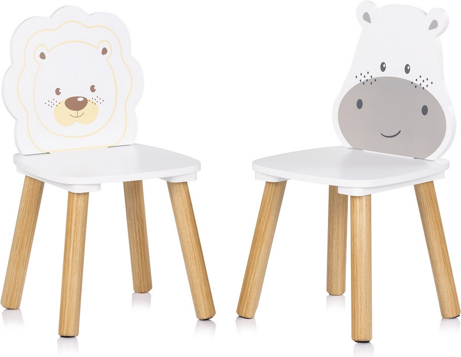 To stole med søde dyre-ryglæn – flodhest og løve – stimulerer fantasien og gør både læring og leg sjovt.