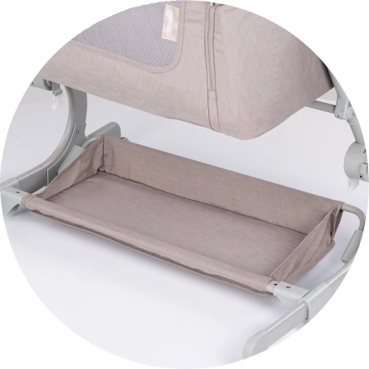 Elegant bedside-crib til forældrenes seng, som på et øjeblik kan forvandles til en selvstændig seng. Tre justerbare niveauer hjælper med at udligne højden perfekt til sengen og gør nattelig pleje lettere. Åndbare netsider sikrer optimal luftcirkulation og uafbrudt visuelt overblik over babyen.