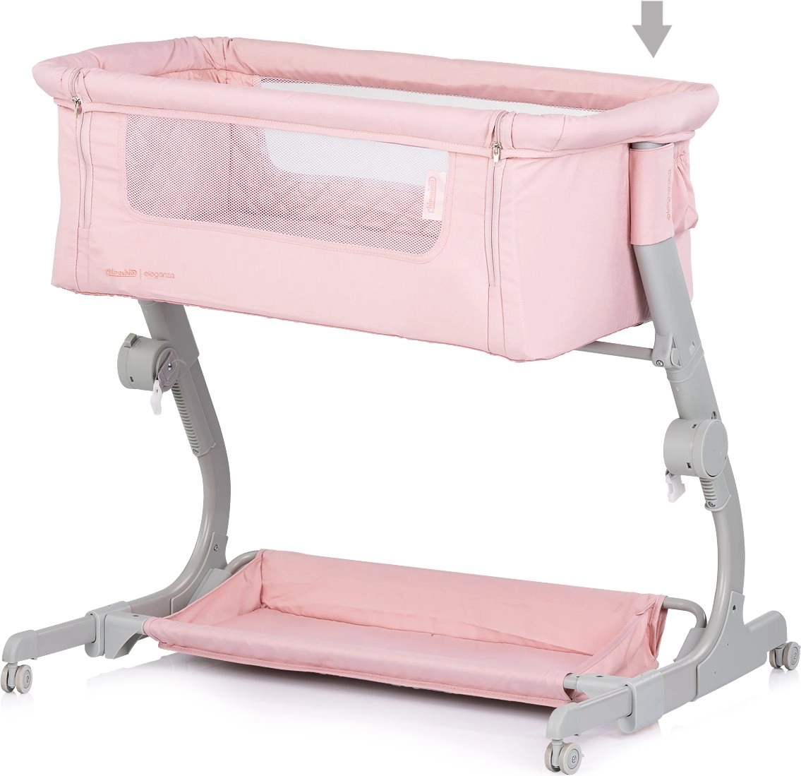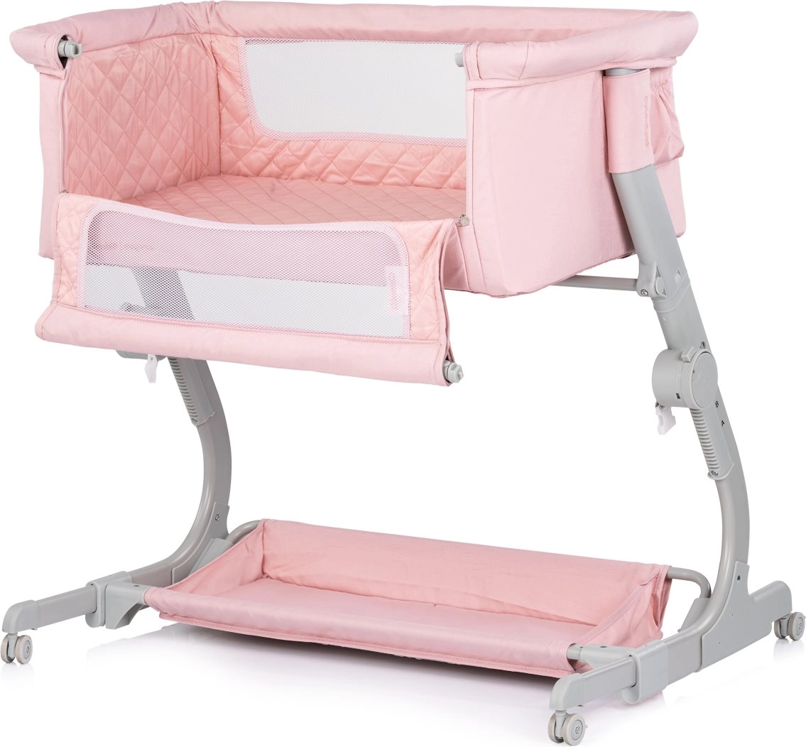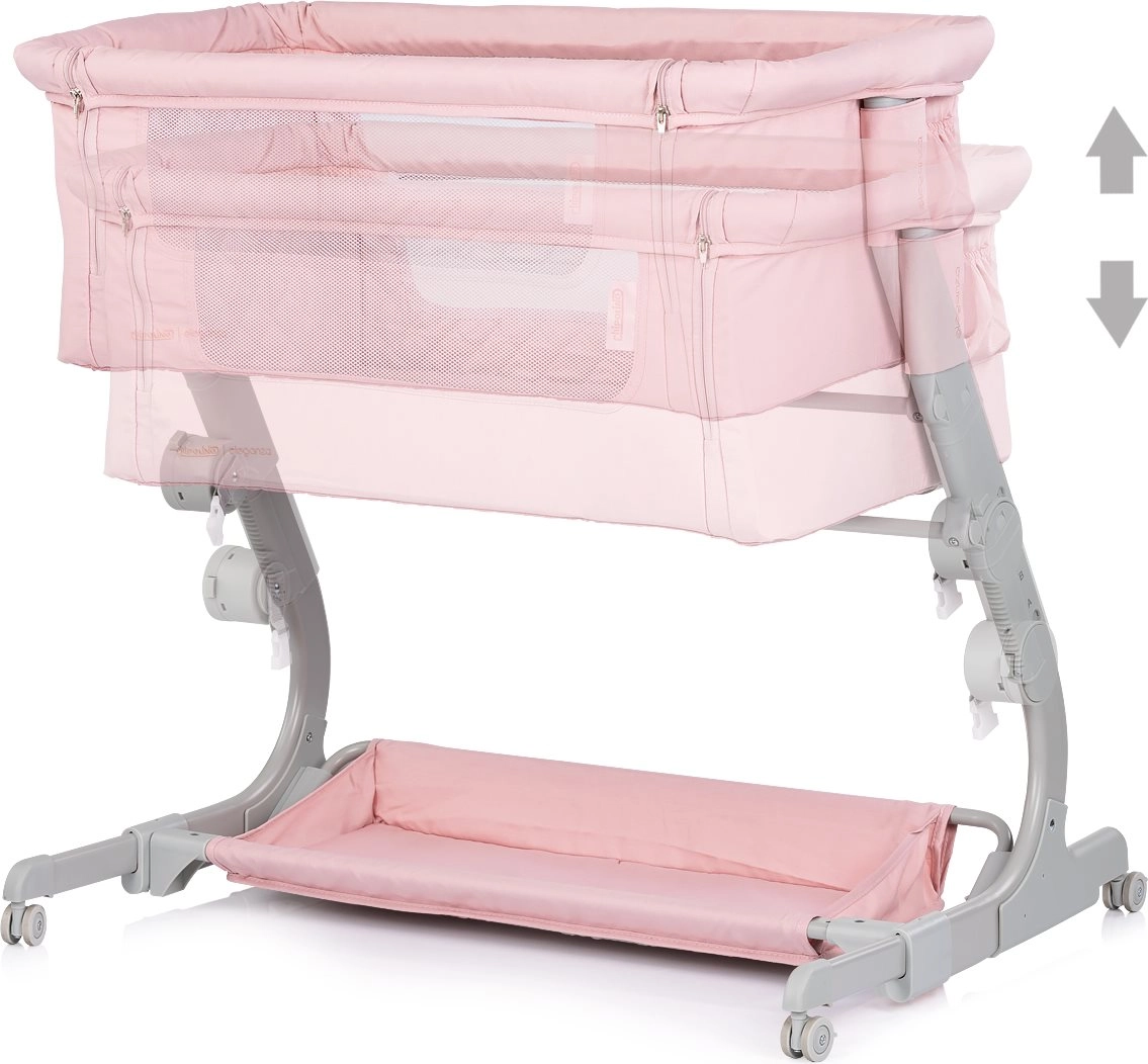 Den praktiske børneseng og bedside-crib 2-i-1 CHIPOLINO Eleganza i en blid lyserød nuance giver din baby et sikkert og hyggeligt sted til søvn og hvile. Takket være 3 højdepositioner, net-sider for overblik og luftcirkulation, låselige hjul og en let, men stabil metalkonstruktion er den ideel til daglig brug og rejser – inklusive kompakt rejsetaske.