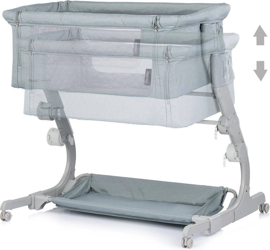 Den praktiske 2-i-1 børneseng og sidebed CHIPOLINO Eleganza tilbyder et sikkert og hyggeligt sted for babyens søvn både hjemme og på farten. Takket være 3 højdepositioner, mesh-sider for ventilation, blød madras og låselige hjul kan den nemt tilpasses din seng og den daglige pleje. Der medfølger en rejsetaske for nem opbevaring og transport.