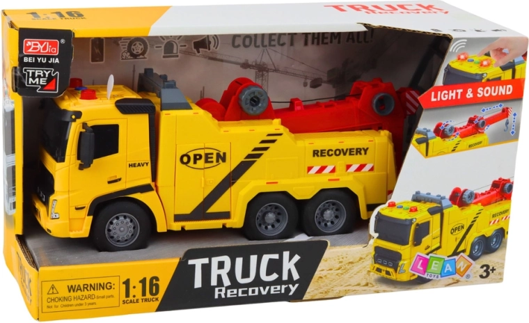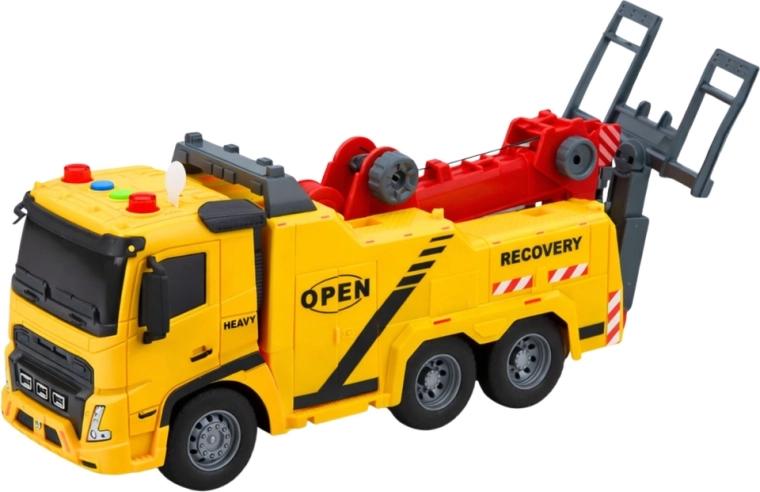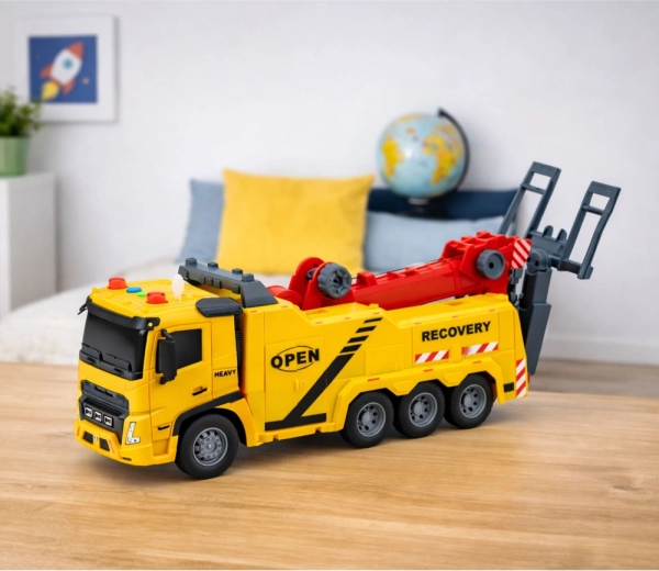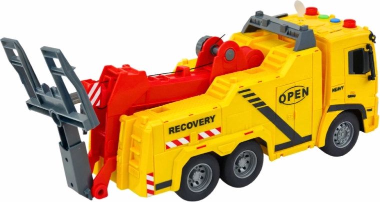 Bugseringsbilen i klar gul med røde detaljer ligner en ægte vejservice. Børn vil nyde autentisk leg takket være en funktionel arm med krog, en vipbar platform og knapper på taget, der aktiverer lys og lyde. Modellen udvikler fantasi, finmotorik og øje–hånd-koordination.
