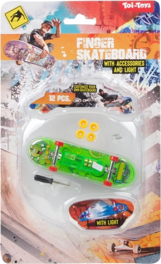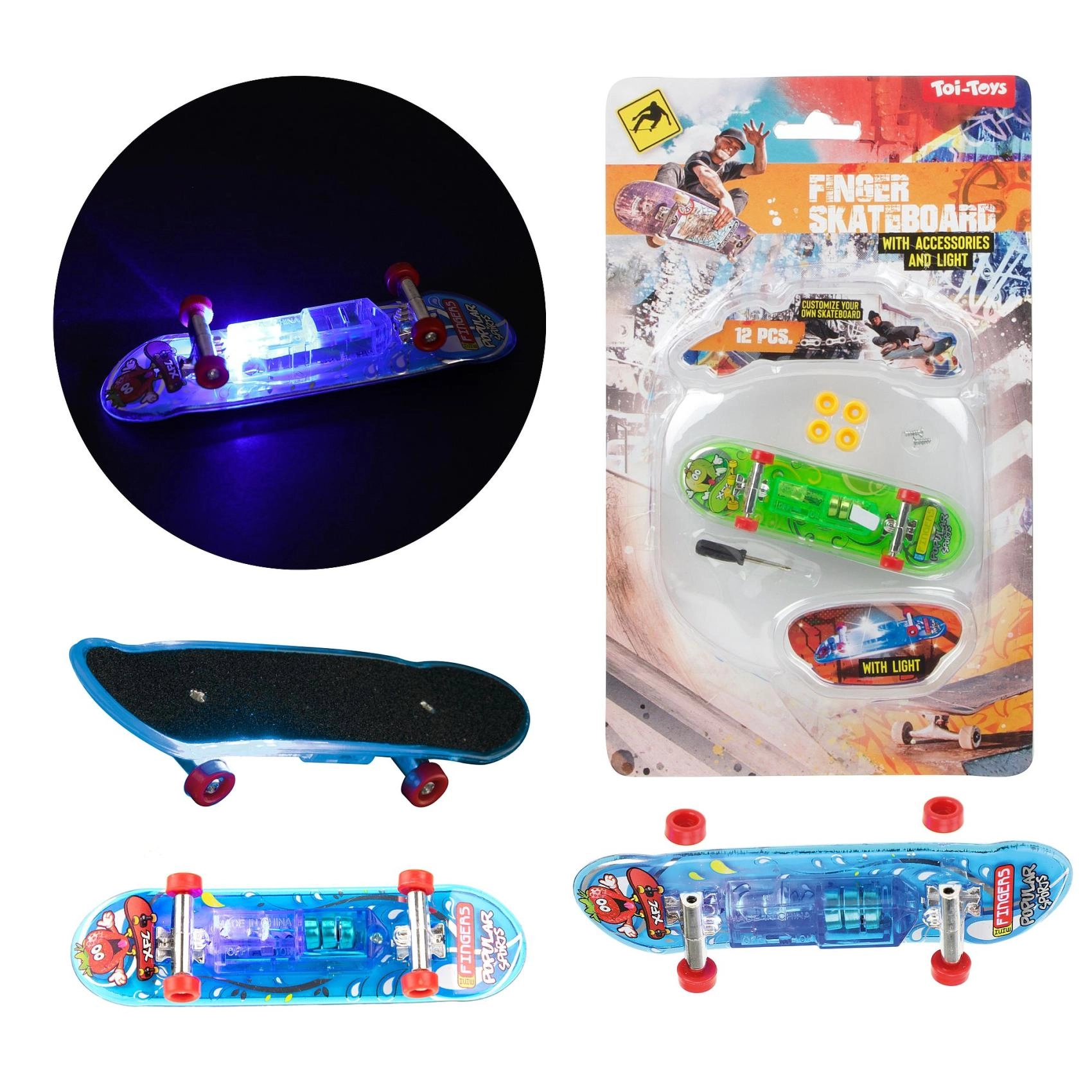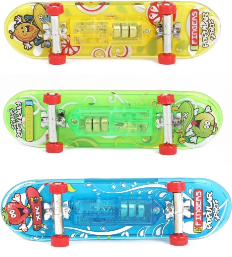 Sjov fingerboard på 9,5 cm med batteridrift og integreret LED-belysning for effektfuld kørsel og tricks. Det kompakte format, den robuste udførelse og lyseffekterne glæder både børn og begyndere inden for fingerboarding. Fås i 3 iøjnefaldende farver med gennemsigtigt chassis, metaltrucks og hjul der ruller glat.