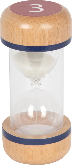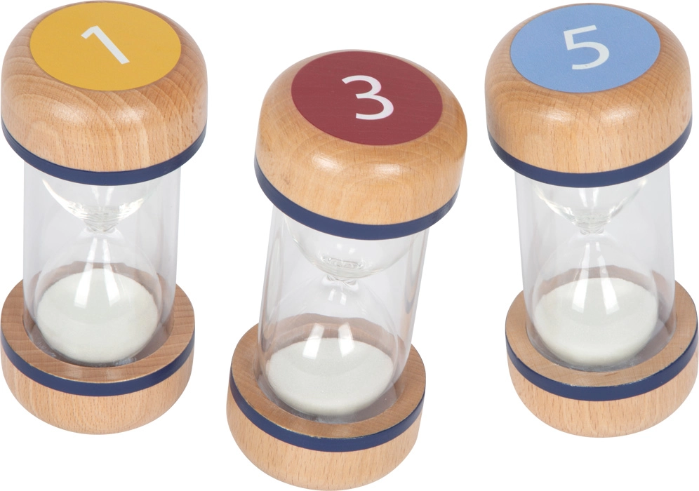 Styrk børns koncentration og selvorganisering med et praktisk sæt timeglas. De farvekodede tidsintervaller på 1, 3 og 5 minutter gør det nemt at indstille og visuelt følge korte opgaver og pauser. Den transparente krop med hvidt sand giver klar synlighed, mens de robuste endestykker i bøgetræ giver stabilitet og et sikkert greb.