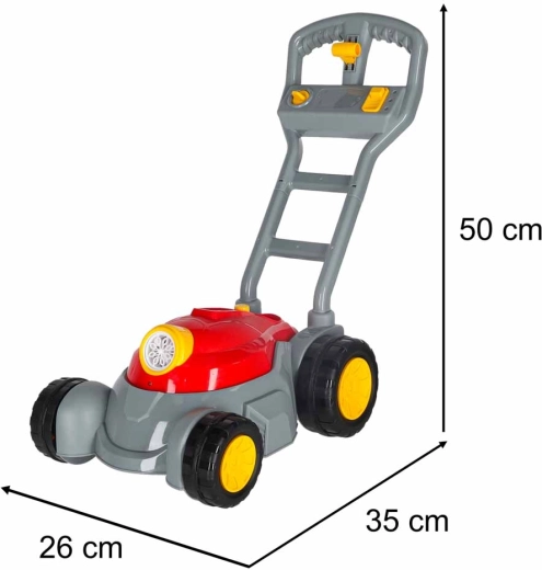 Når plæneklipperen skubbes, frigiver den selv masser af sæbebobler, som forvandler en almindelig gåtur til et sjovt eventyr.