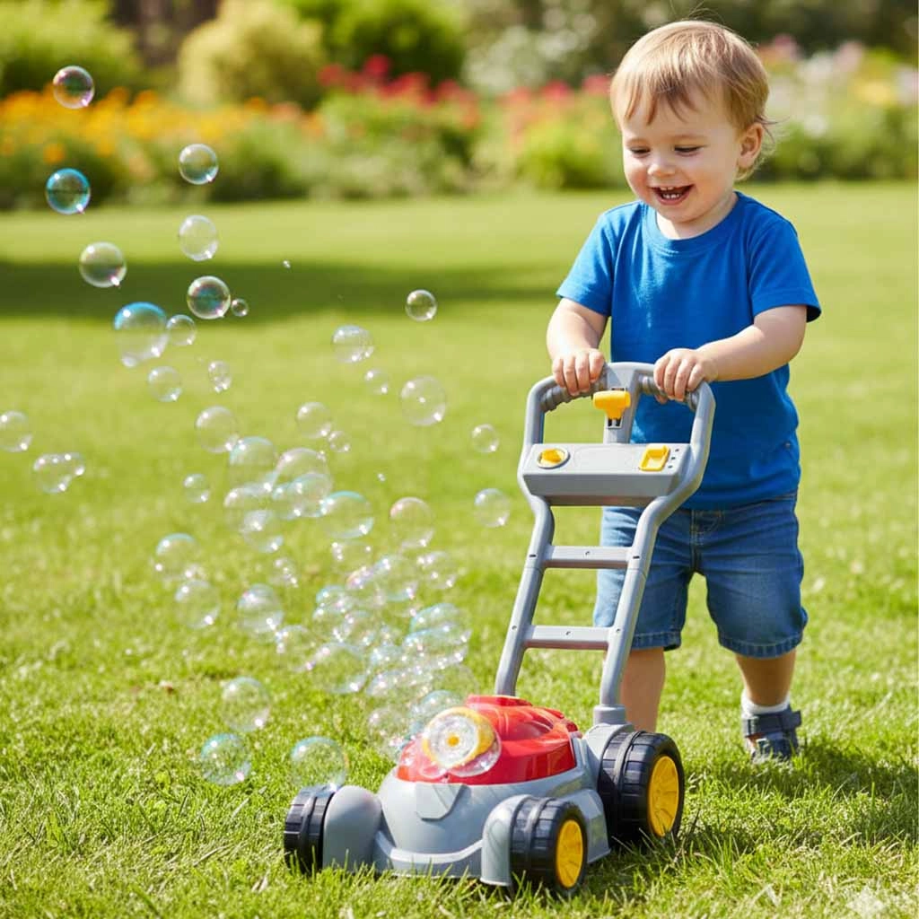 Denne realistiske børneplæneklipper forvandler hvert skridt til en storm af farverige sæbebobler. Takket være automatisk bobleudslip, blå bagbelysning og behagelige lydeffekter får børn masser af glæde ved aktiv leg i haven, på terrassen og indendørs.