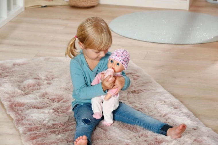 Med følger en lyserød sparkedragt, en matchende hue og en flaske. Tøjet i BABY born-størrelse 36 cm passer perfekt og kan nemt kombineres.