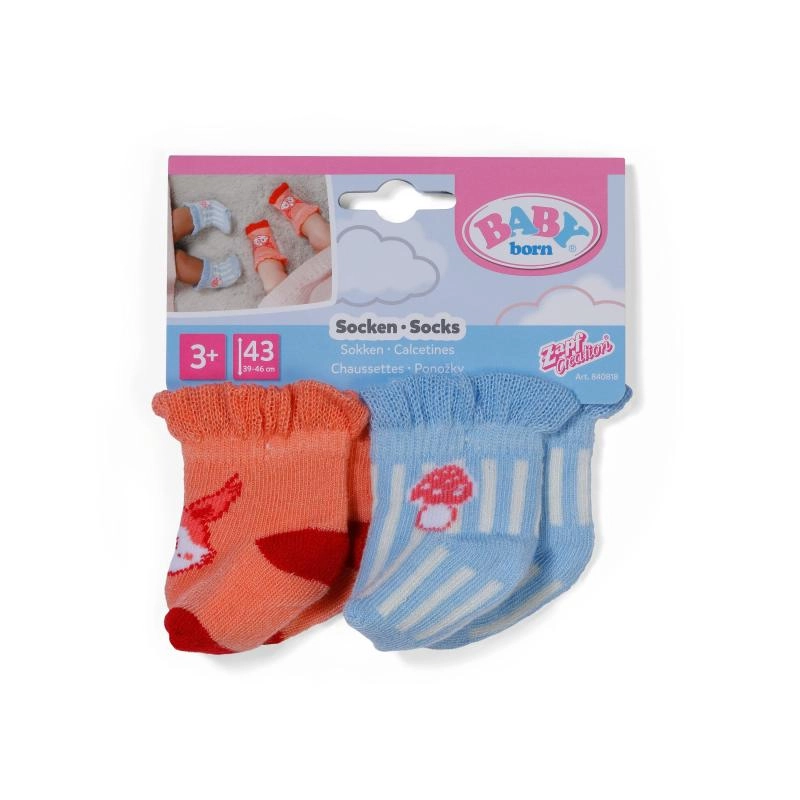 Hver pakke indeholder 2 par i matchende farver og med søde motiver. Vælg mellem to varianter: et blidt og legende sæt med får og sommerfugl eller en mere iøjnefaldende kombination med ræv og fluesvamp. Strømperne fuldender garderoben til alle BABY born-outfits og støtter fantasiudviklingen under legen.