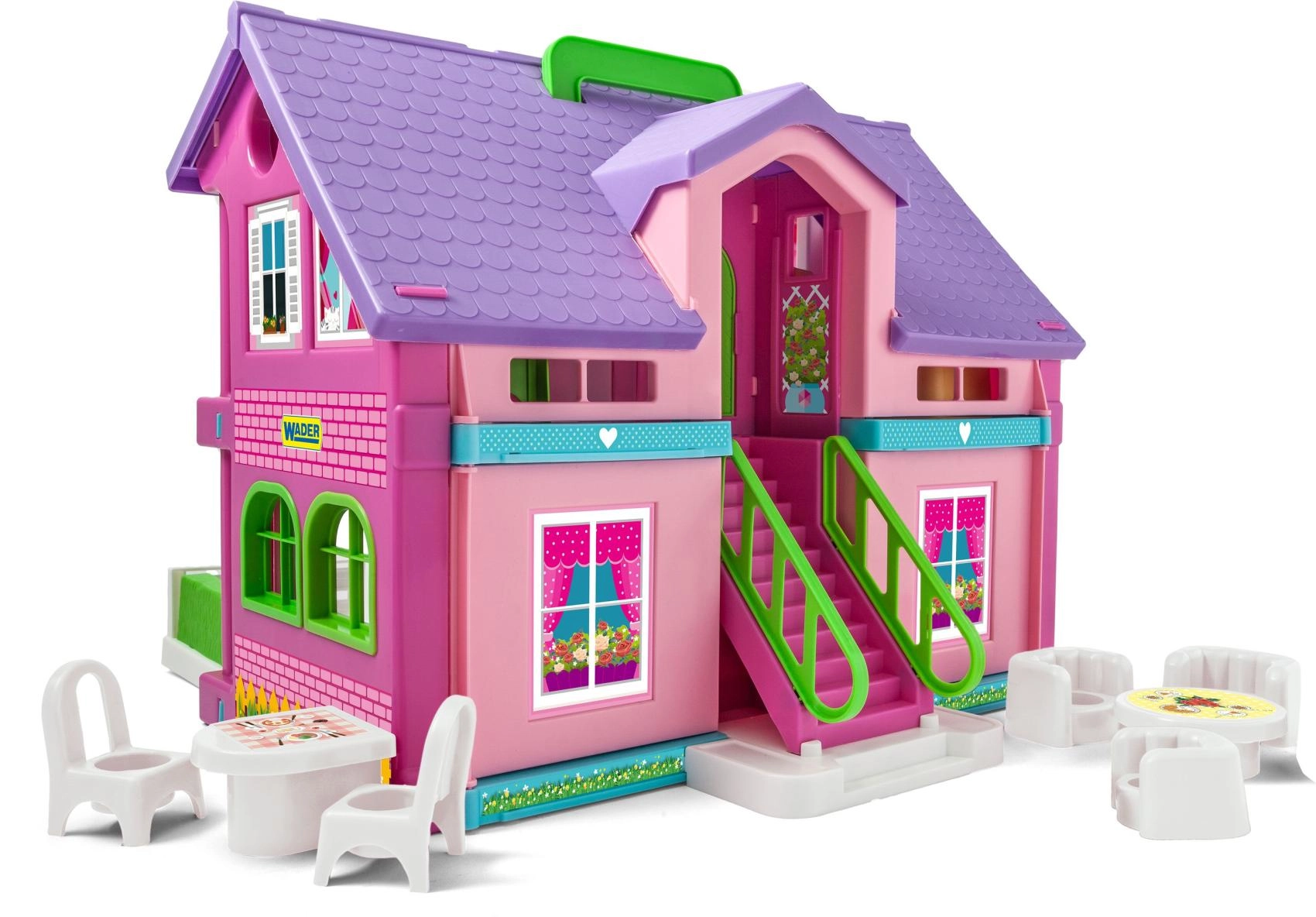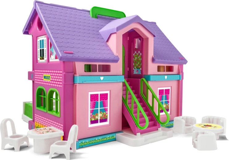 Smukt plastdukkehus fra Wader med åbent design for nem adgang fra alle sider, holdbar konstruktion og rigt tilbehør. Understøtter kreativitet, ordforrådsudvikling og social leg for børn fra 12 måneder.