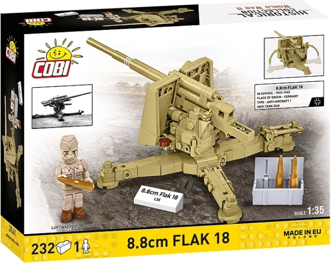Byg den ikoniske kanon 8,8 cm Flak 18 i realistisk skala 1:35. Sættet indeholder 232 klodser, detaljerede bevægelige elementer (elevation, 360° rotation, nedklappelige støtter), en minifigur af artillerist og samler-tilbehør. Ideelt til fans af historiske modeller, udstilling og actionfyldt leg.