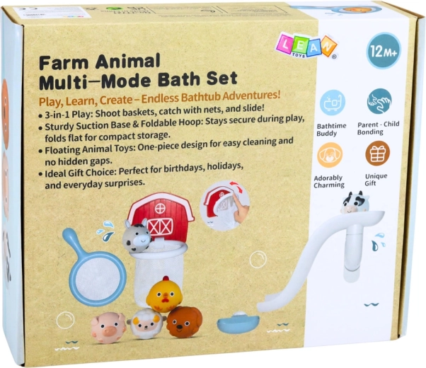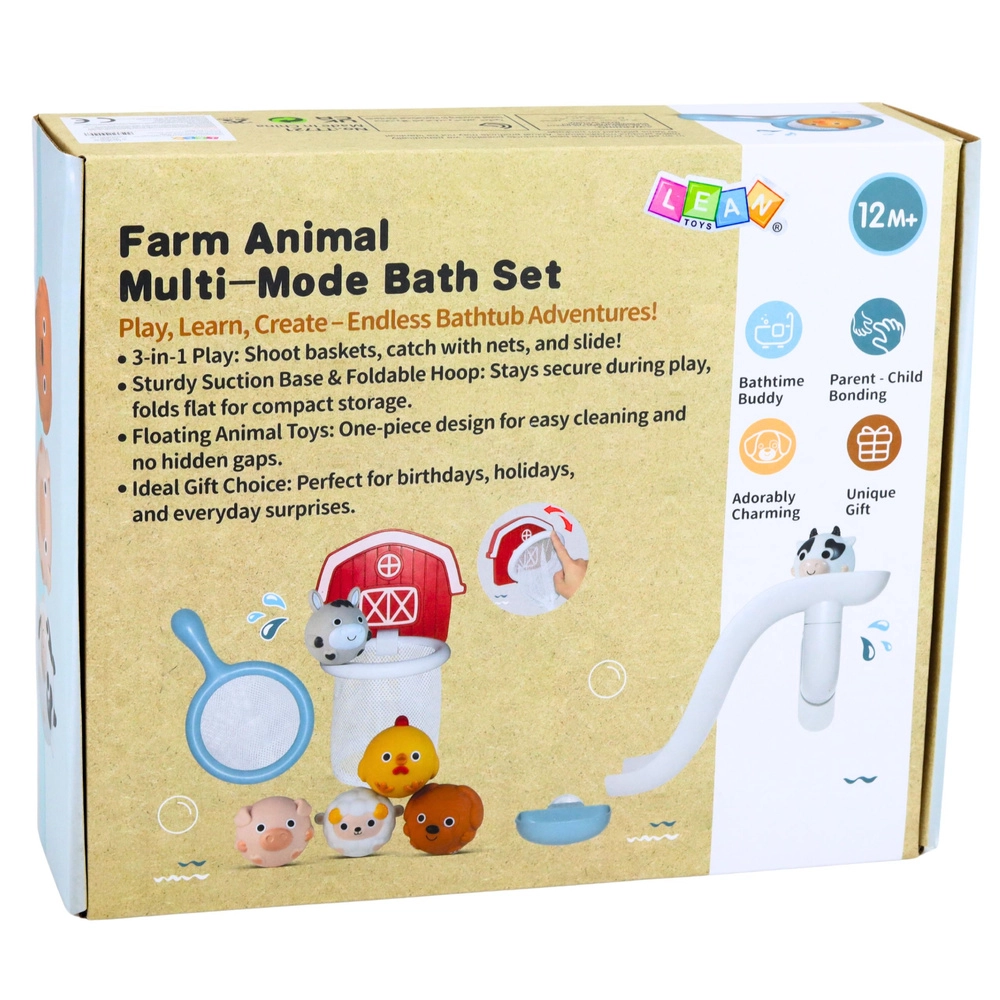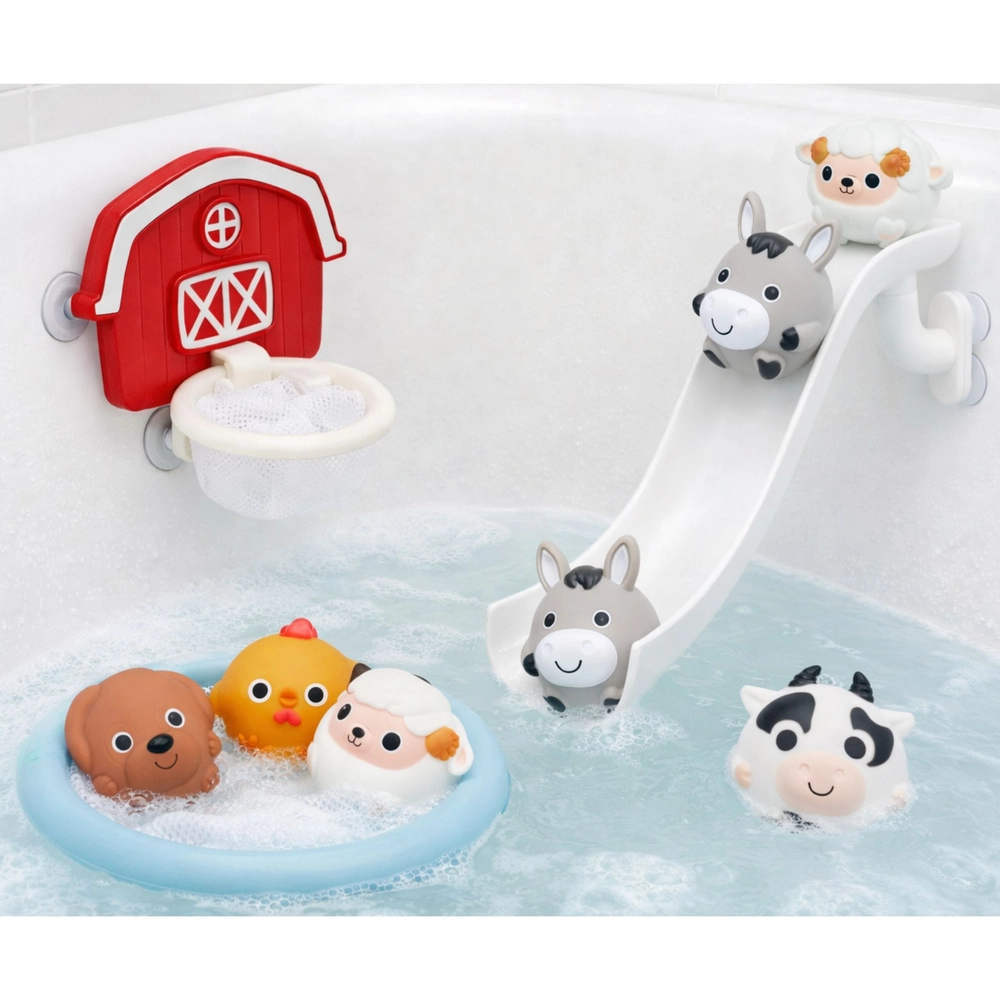 Gør badetiden sjov med et gårdtema-sæt! Børn vil elske rutsjebanen til dyrene, kurven med net til at fange med og de sprøjtende og klemmede dyr, som flyder på vandet. Delene fæstnes let på glatte overflader takket være sugekopper, og de bløde, sikre materialer er velegnede til små børnehænder.
