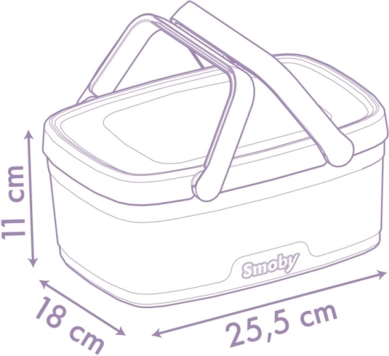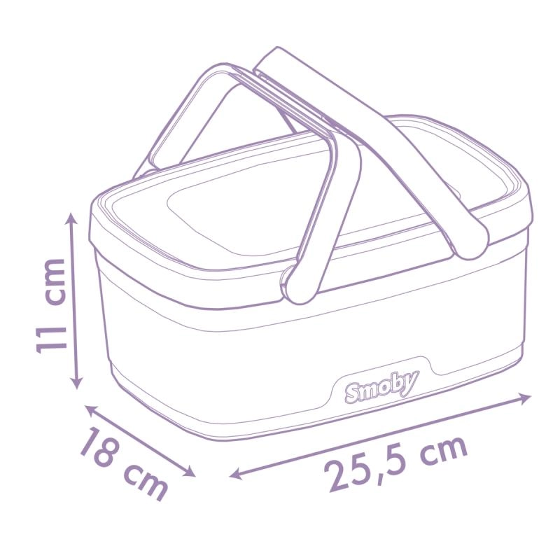 Der medfølger 14-delt tilbehør, ideelt til leg for to: 2 tallerkener, 2 teskeer, 2 knive, 2 gafler, 2 glas, en vaffel, flødeskum, blåbærtærte og en flaske limonade. Alt passer nemt ned i kurven, så sættet er let at opbevare og klar til at tage med.