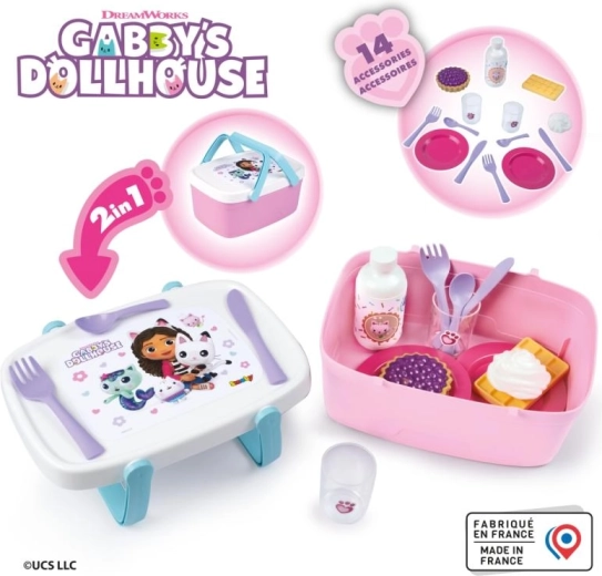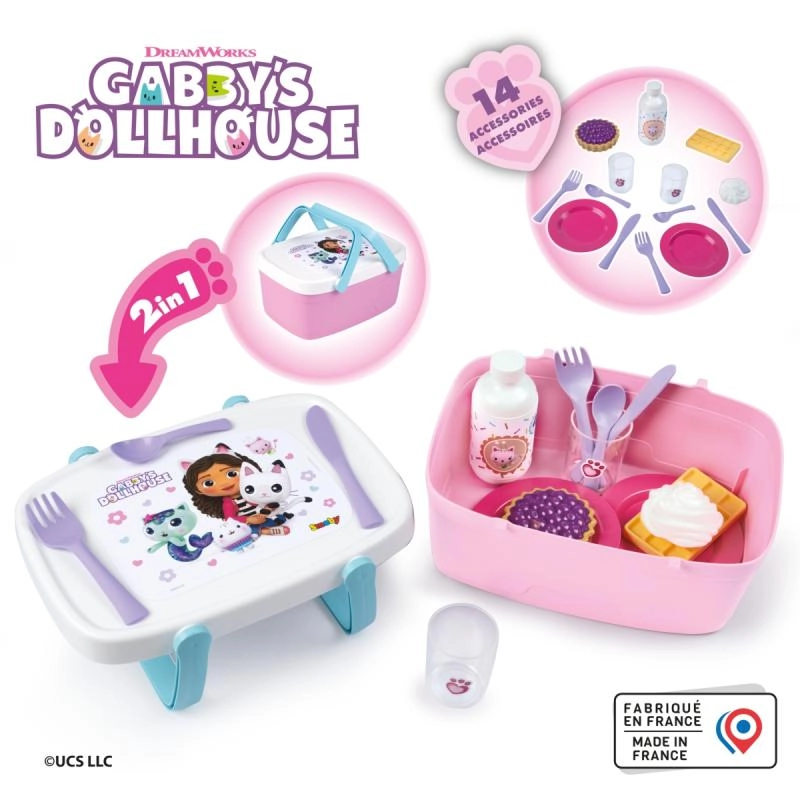 Denne søde 2-i-1 picnickurv giver børn timevis af kreativ underholdning. Takket være den smarte løsning forvandles låget til et praktisk lille bord, når håndtagene klappes ned, så små værter kan servere drikke og godter. Det tematiske design af GABBY’S DOLLHOUSE vil glæde alle fans af den populære serie.