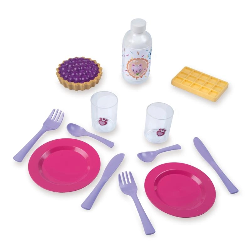 Tallerkener, bestik, glas og søde lækkerier gør det muligt for børn at dække et komplet bord til to.