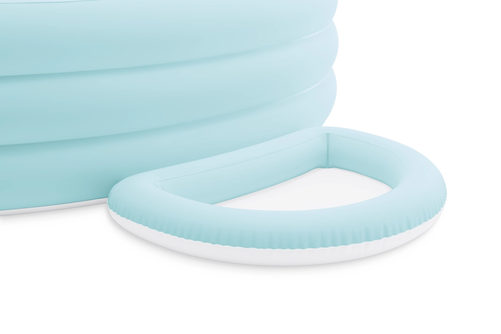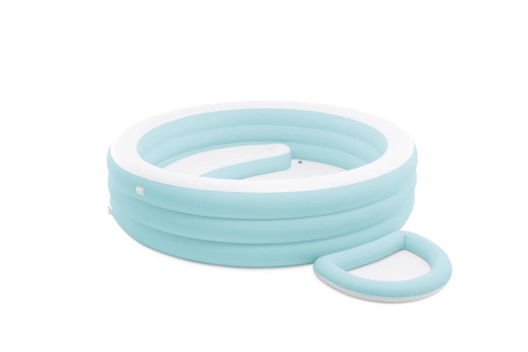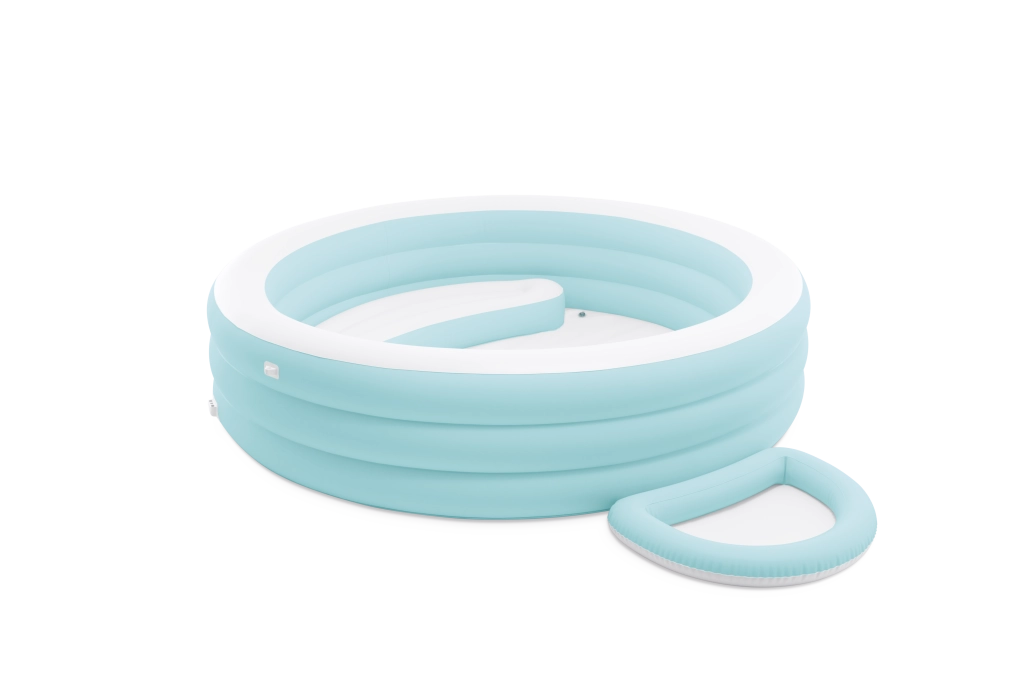 Den oppustelige pool med baldakin Swim Center Canopy Lounge leverer komfort og funktionalitet i en elegant lyseblå udførelse. Tre kamre rundt om kanten sikrer stabilitet og behagelig, blød støtte, mens det integrerede oppustelige sæde og separat fodbad øger komforten under afslapning og leg.