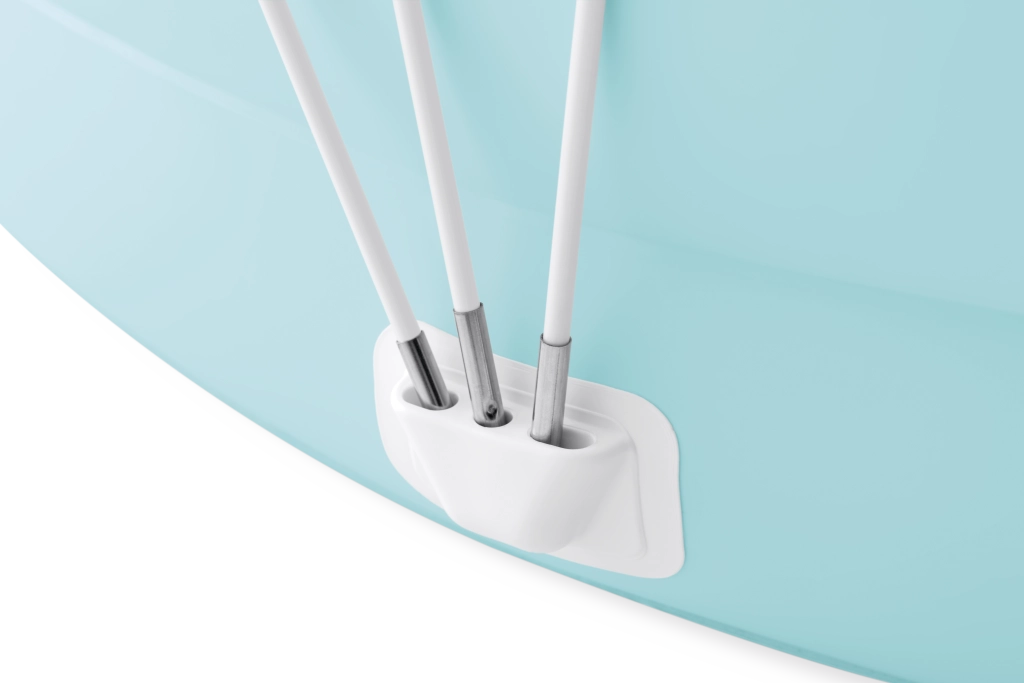 Den aftagelige baldakin i let materiale med UPF 50+ giver pålidelig skygge på varme dage. Stabil fastgørelse med solide stænger og holdere sikrer sikker brug og nem afmontering. Takket være aftapningsventilen i bunden af poolen er det hurtigt og enkelt at tømme vandet uden besværlig håndtering.