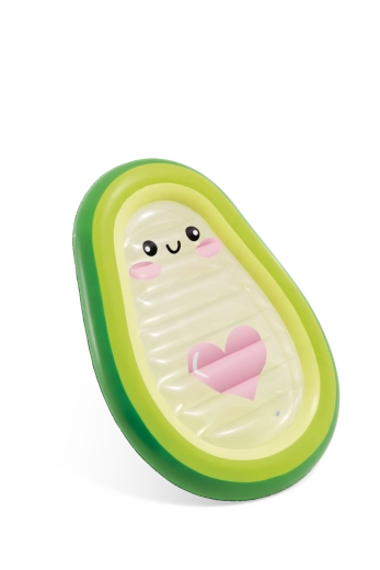 Den oppustelige liggemåtte Avocado Buddy bringer et frisk, avocado-inspireret design til din sommerrelaks. Den ydre kant i grønne nuancer går glidende over i lysere toner og gul, mens det gennemsigtige midterstykke med et sødt tegnet ansigt og et lyserødt hjerte giver et originalt udtryk. Det robuste, gennemsigtige PVC er ideelt til vandleg og lader dig betragte livet under overfladen.