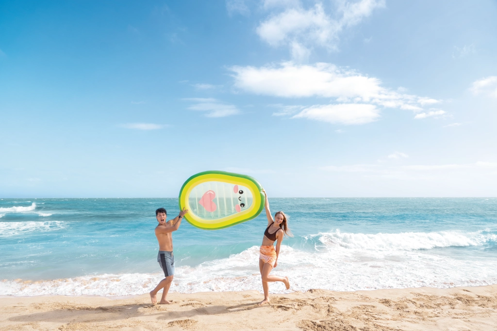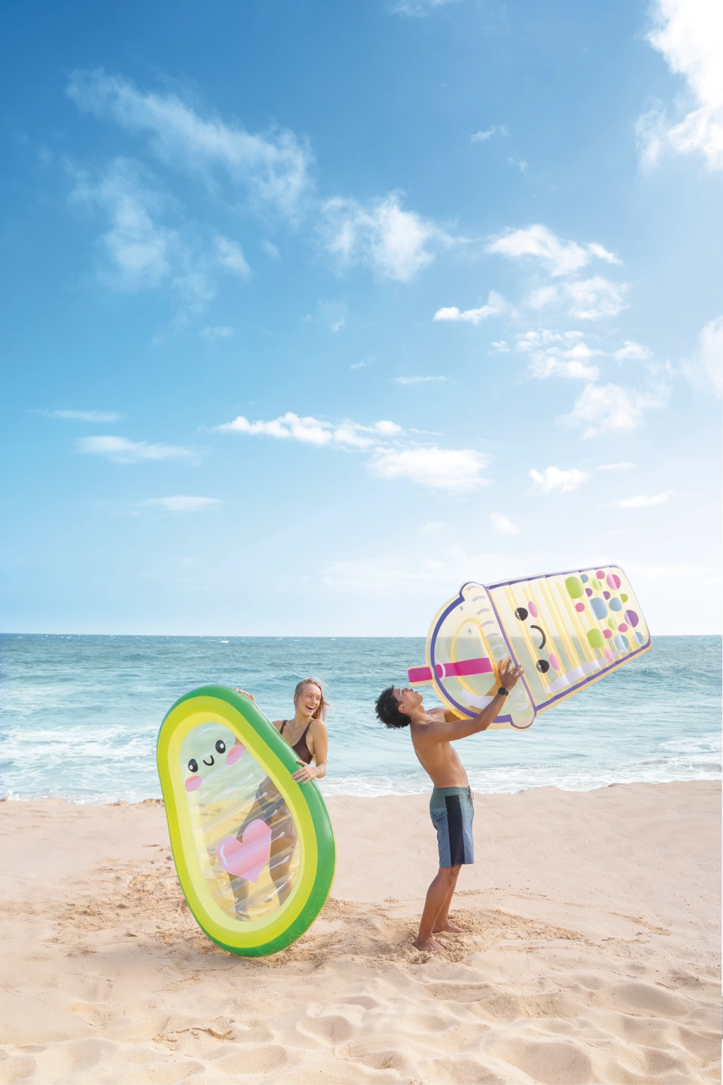 Det gennemsigtige midterstykke med et sødt ansigt og et lyserødt hjerte giver liggemåtten et unikt udseende – perfekt til billeder fra strand og pool.