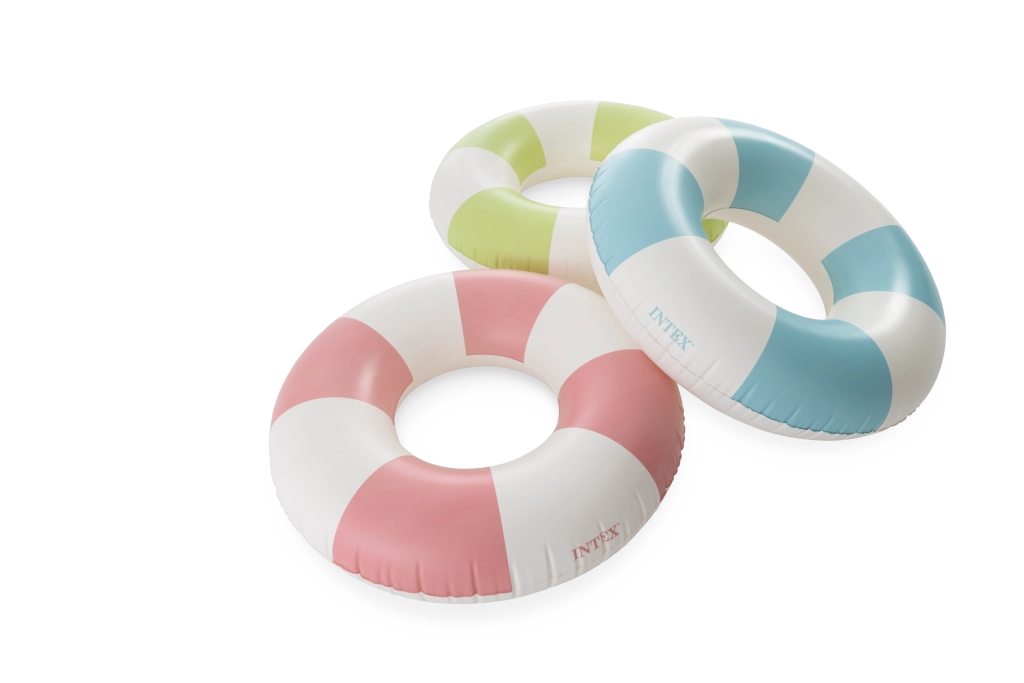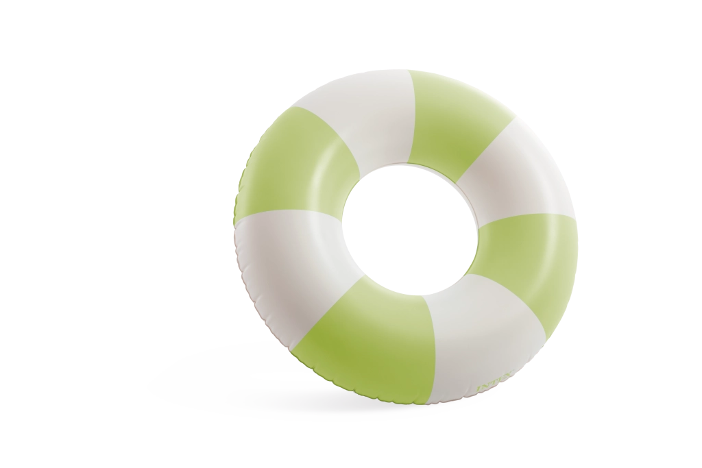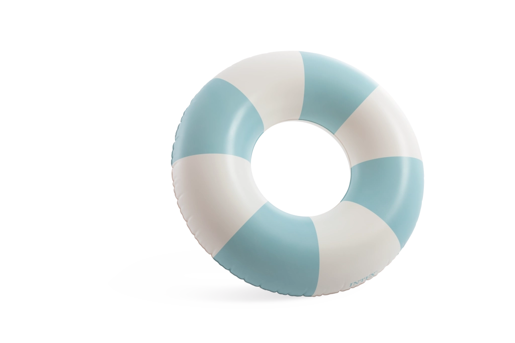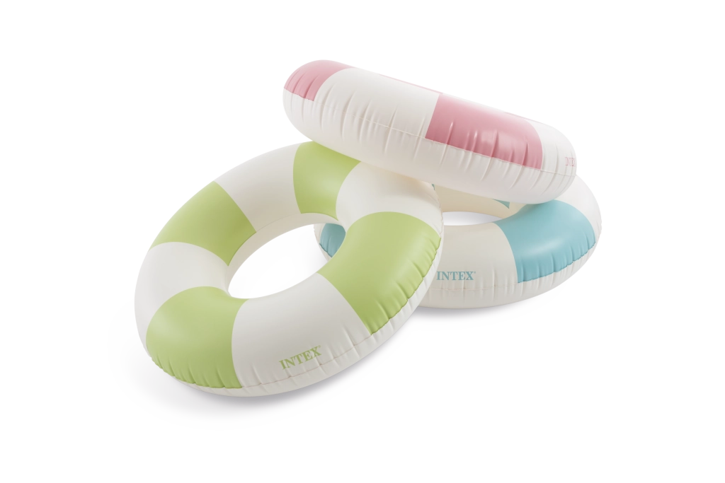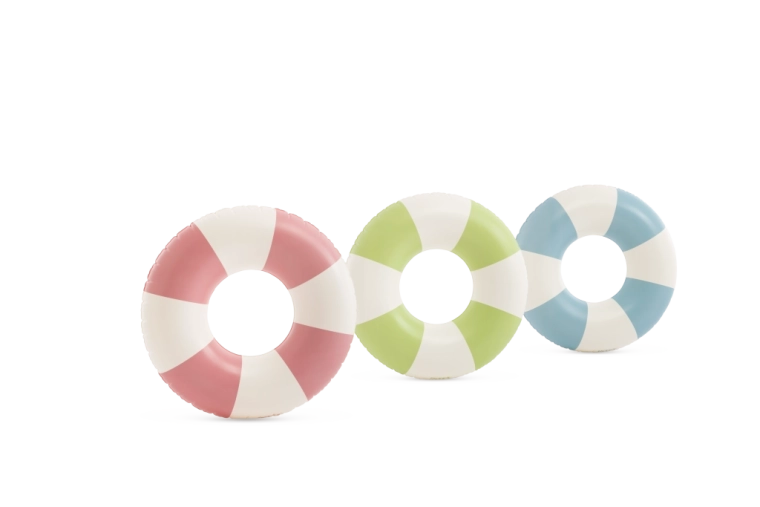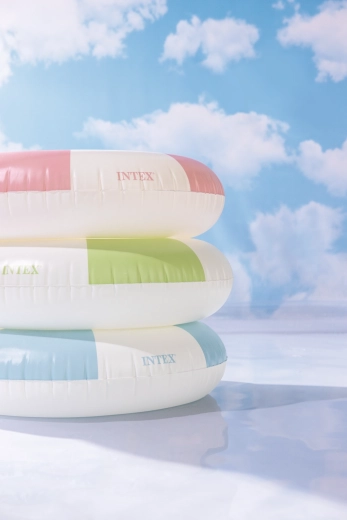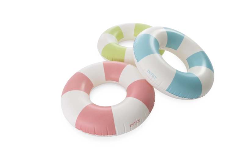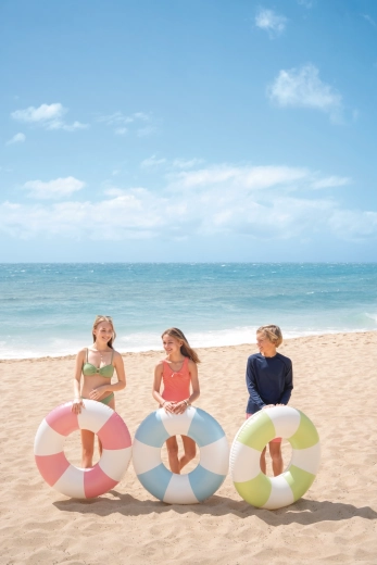 Den oppustelige badering Coastal Cabana kombinerer et frisk design i pastelnuancer af blå, grøn og pink med praktiske funktioner for sikre og komfortable vandaktiviteter. Med en diameter på 91 cm giver den rigelig plads og komfort både i poolen og ved havet.