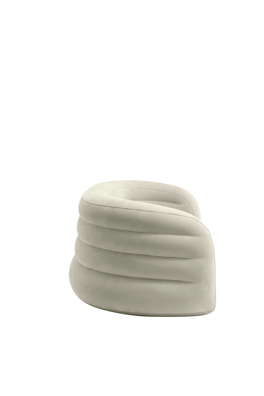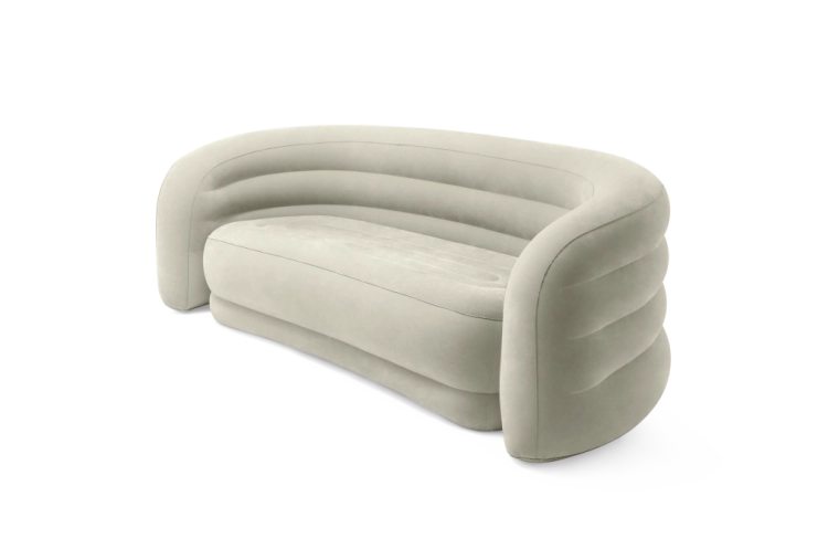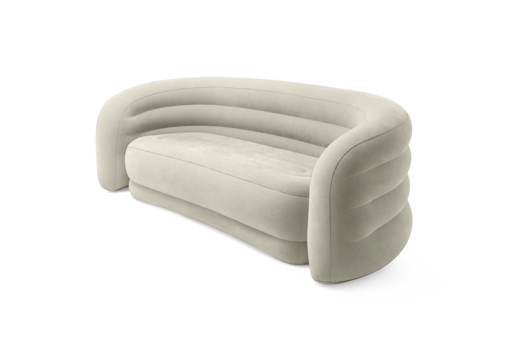 Den oppustelige sofa Curve imponerer med bløde, afrundede linjer, der virker organiske og hyggelige. Plyssammet i en neutral olivenbeige nuance tilføjer elegance og er behagelig at røre ved. Konstruktionen er solid, men let og nem at transportere – ideel til fleksibel indretning.