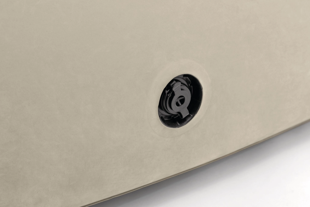 Den stilfulde oppustelige sofa Curve kombinerer moderne design, en fløjlsblød overflade i olivenbeige og maksimal praktikalitet. Takket være 2-i-1-ventilen kan den nemt pustes op og tømmes på få øjeblikke, den er let, transportabel og passer perfekt i stuen, afslapningszonen og på terrassen.