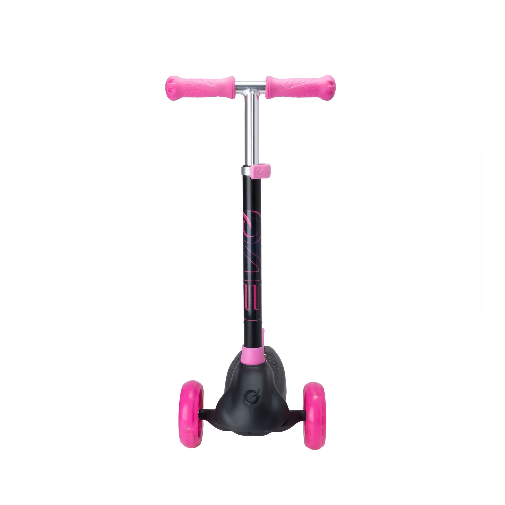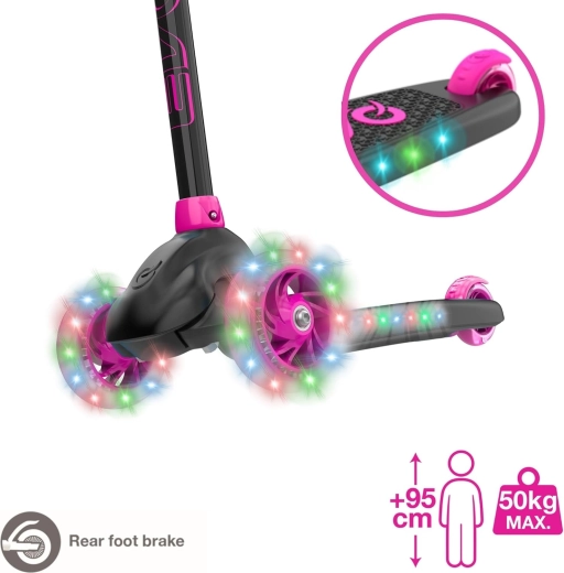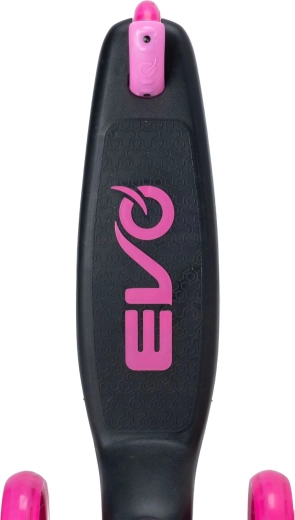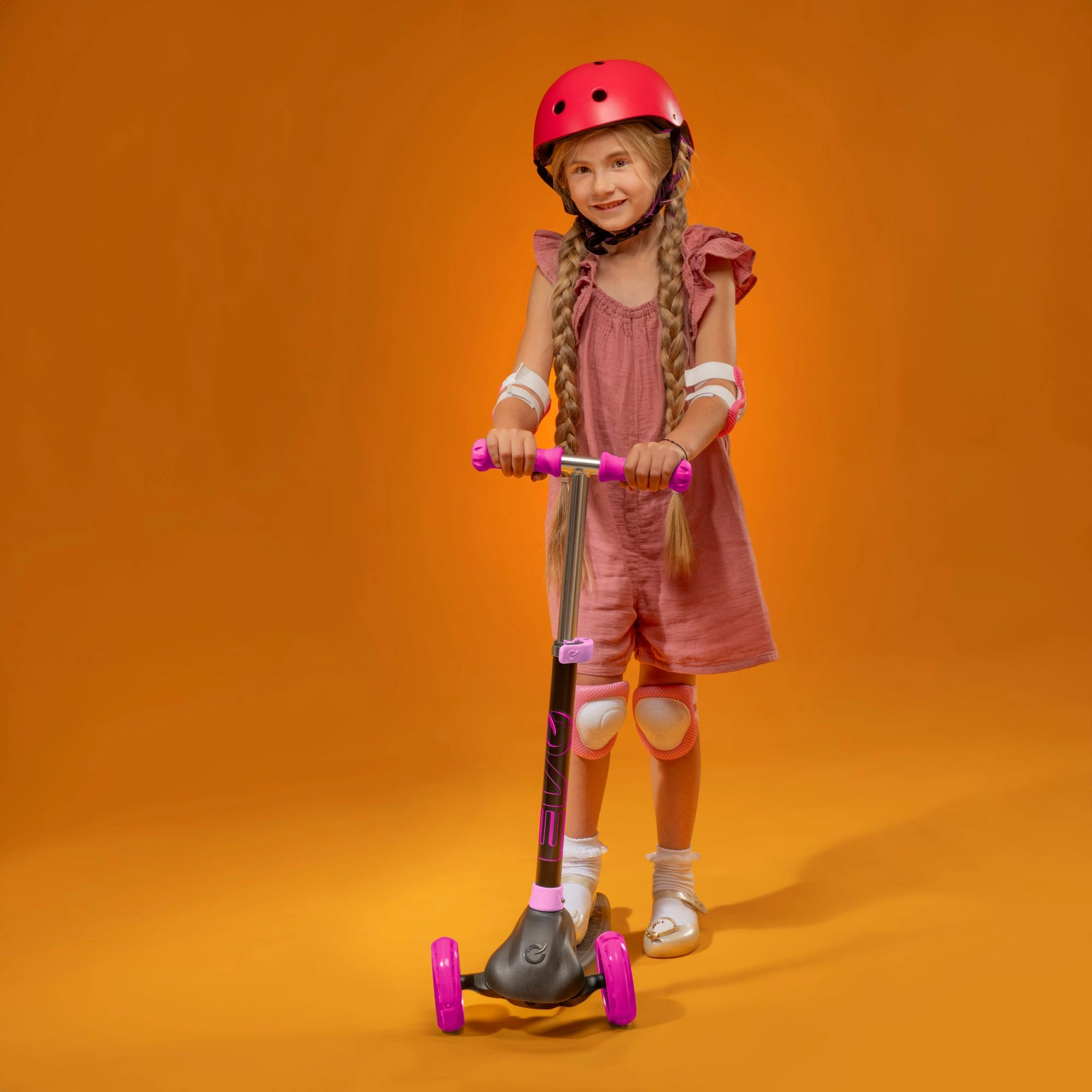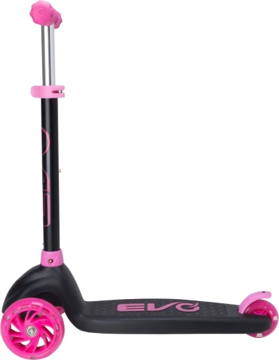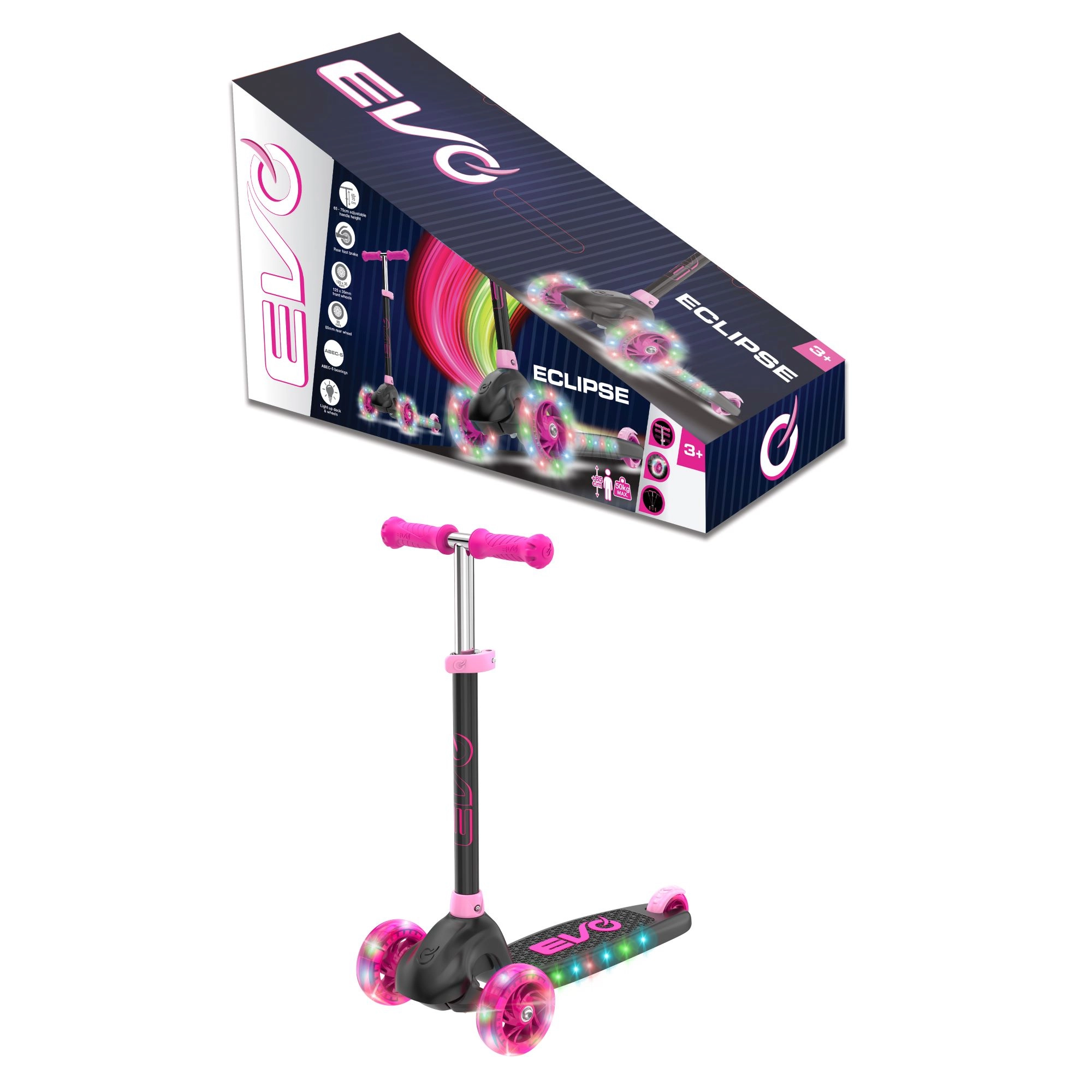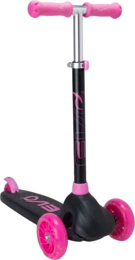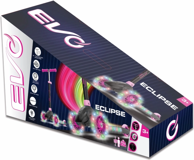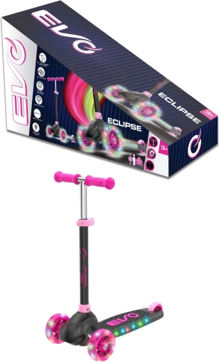 Sjovt og sikkert trehjulet løbehjul til børn fra 3 år. Modellen EVO Eclipse tilbyder stabil kørsel takket være to forhjul, justerbart styr der følger barnets vækst, samt LED-lysende hjul og oplyst understel for bedre synlighed og ekstra køreglæde. Balance-styring udvikler koordination, og fodbremse sikrer tryg opbremsning.