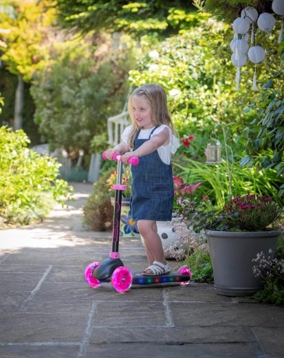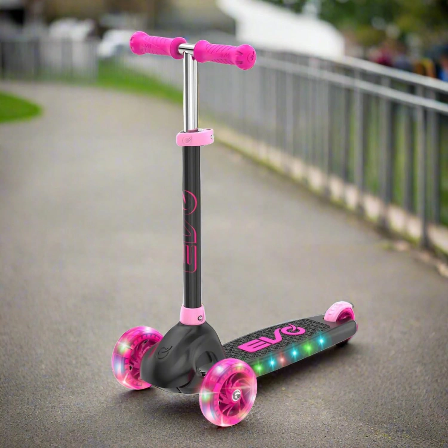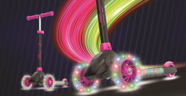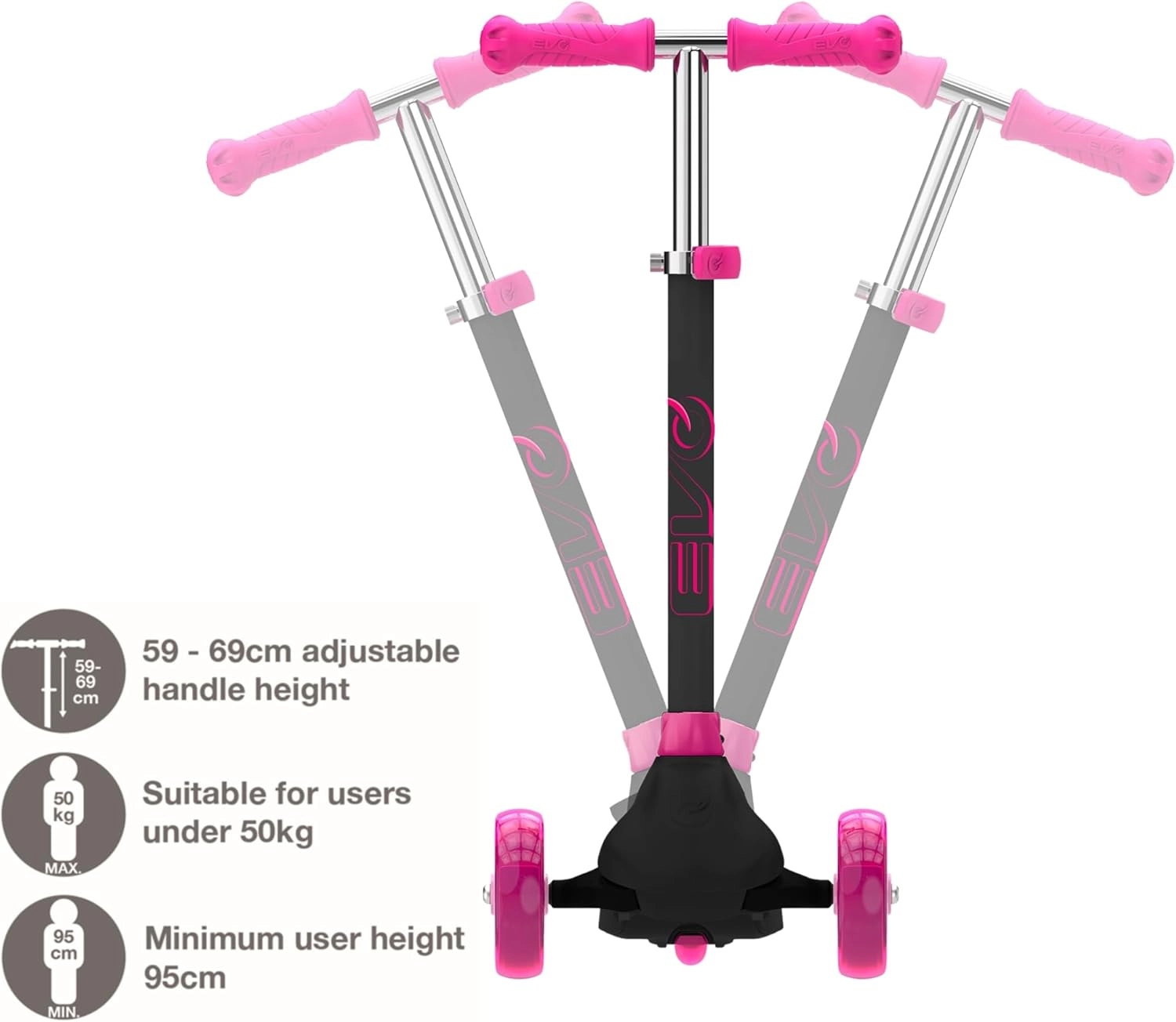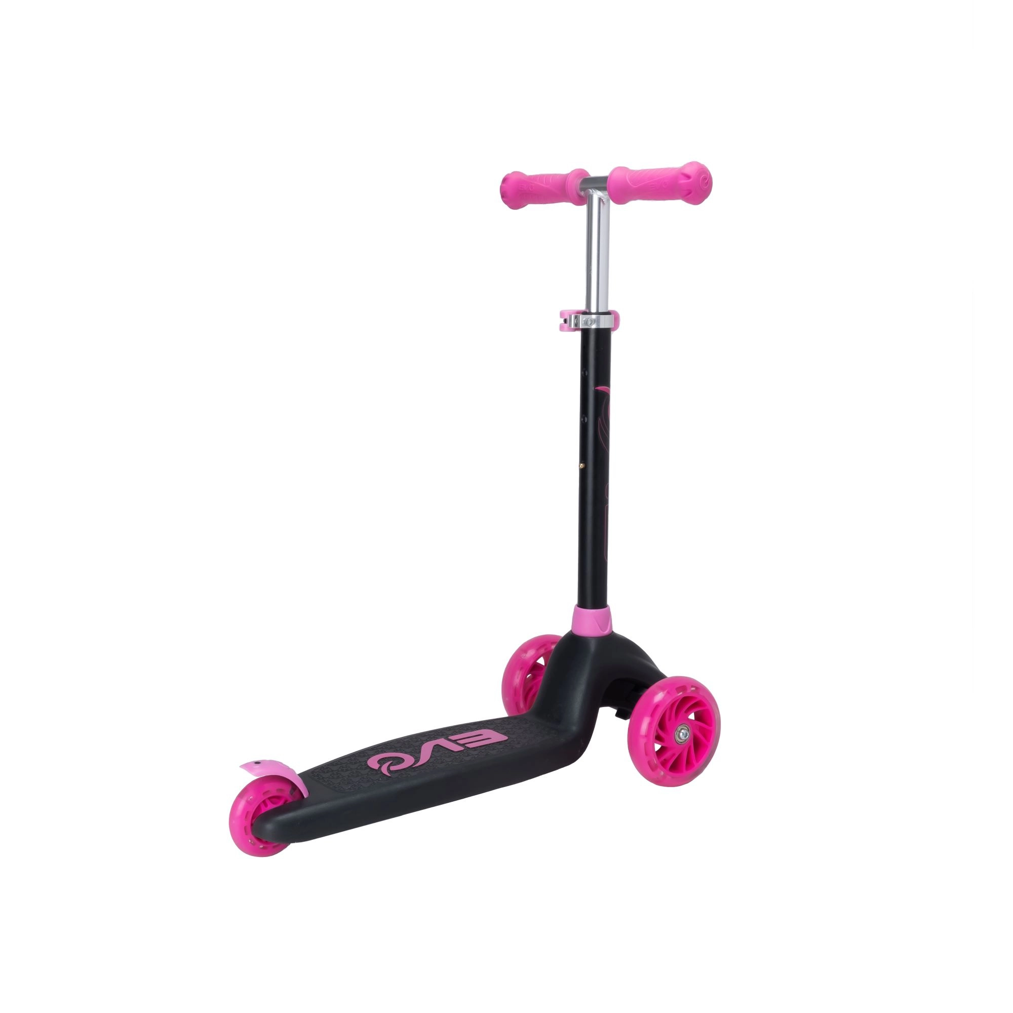 Sjovt og sikkert trehjulet løbehjul til børn fra 3 år. Modellen EVO Eclipse tilbyder stabil kørsel takket være to forhjul, justerbart styr der følger barnets vækst, samt LED-lysende hjul og oplyst understel for bedre synlighed og ekstra køreglæde. Balance-styring udvikler koordination, og fodbremse sikrer tryg opbremsning.