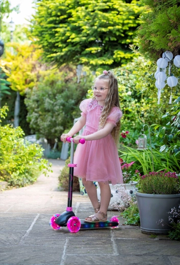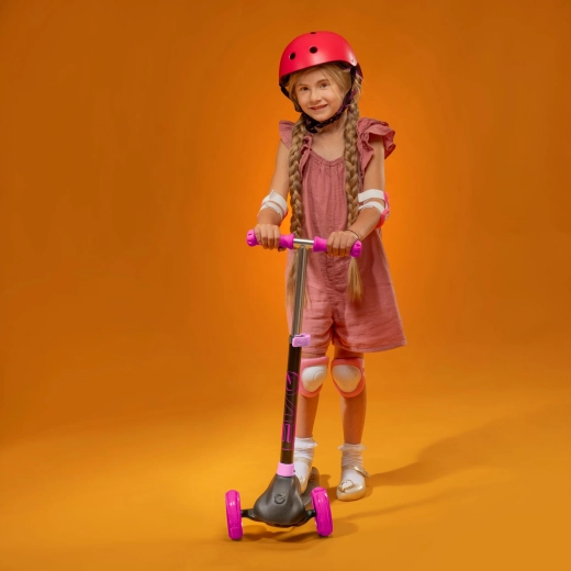 Det voksende design med justerbart styr tilpasses nemt barnets højde. Bløde TPR-greb giver et behageligt og sikkert greb, og fodbremse med skærm på baghjulet muliggør hurtig og sikker standsning. ABEC-5-lejer sørger for jævn og støjsvag kørsel på jævne underlag.