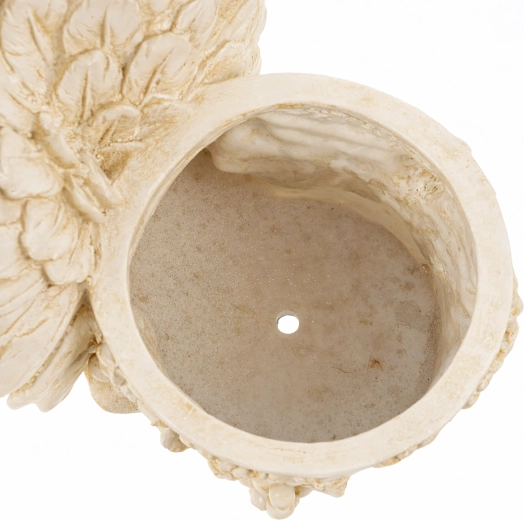 Denne stilfulde blomsterkrukke med skulptur af en sovende lille engel forener dekorativ charme og funktionaliteten fra en plantebeholder. Englekroppen med fint udførte vinger hviler op ad en rund krukke udsmykket med vinrankemotiver, som understreger det antikke stenlook. Passer perfekt både inde og ude – på vindueskarm, altan, terrasse eller i et lille havehjørne.