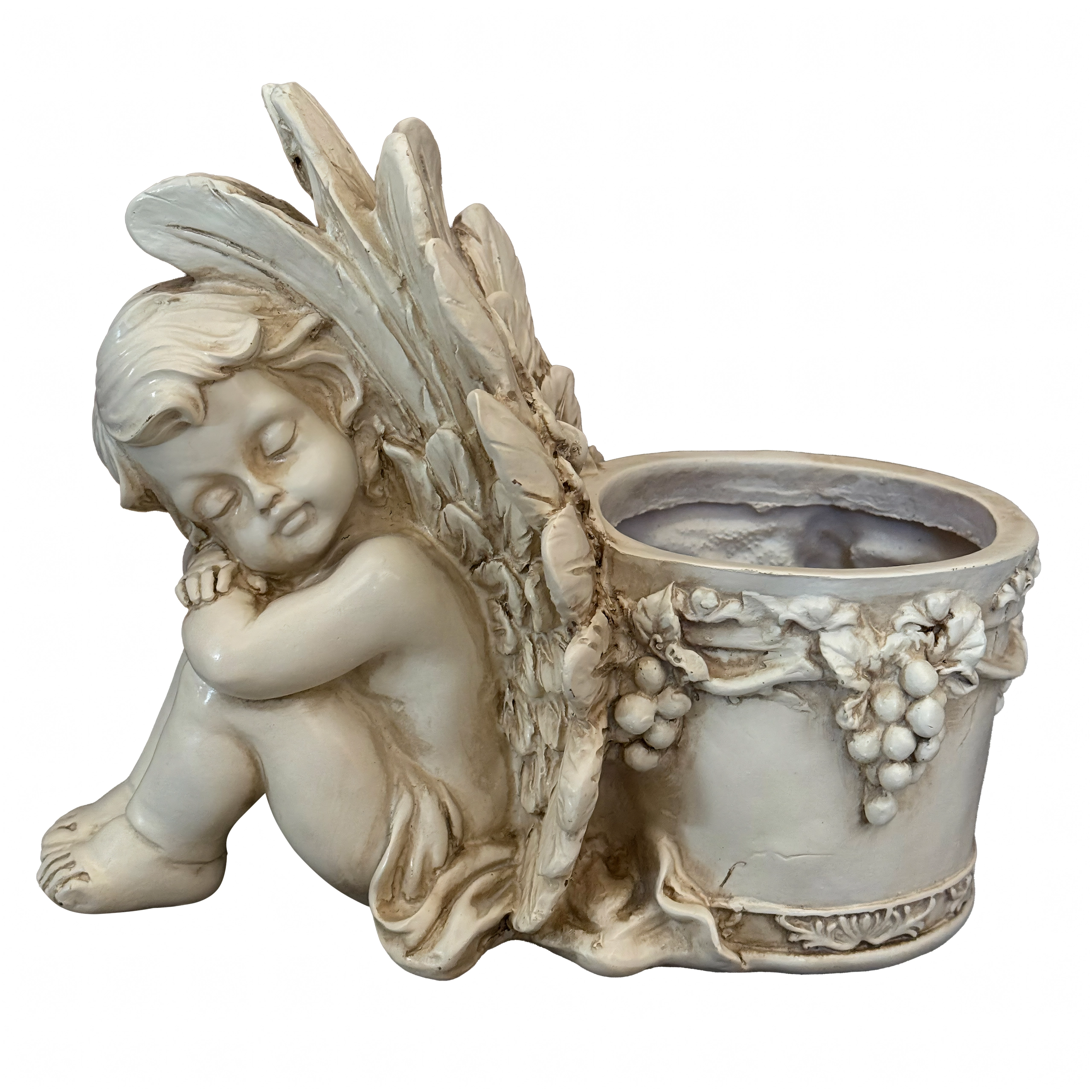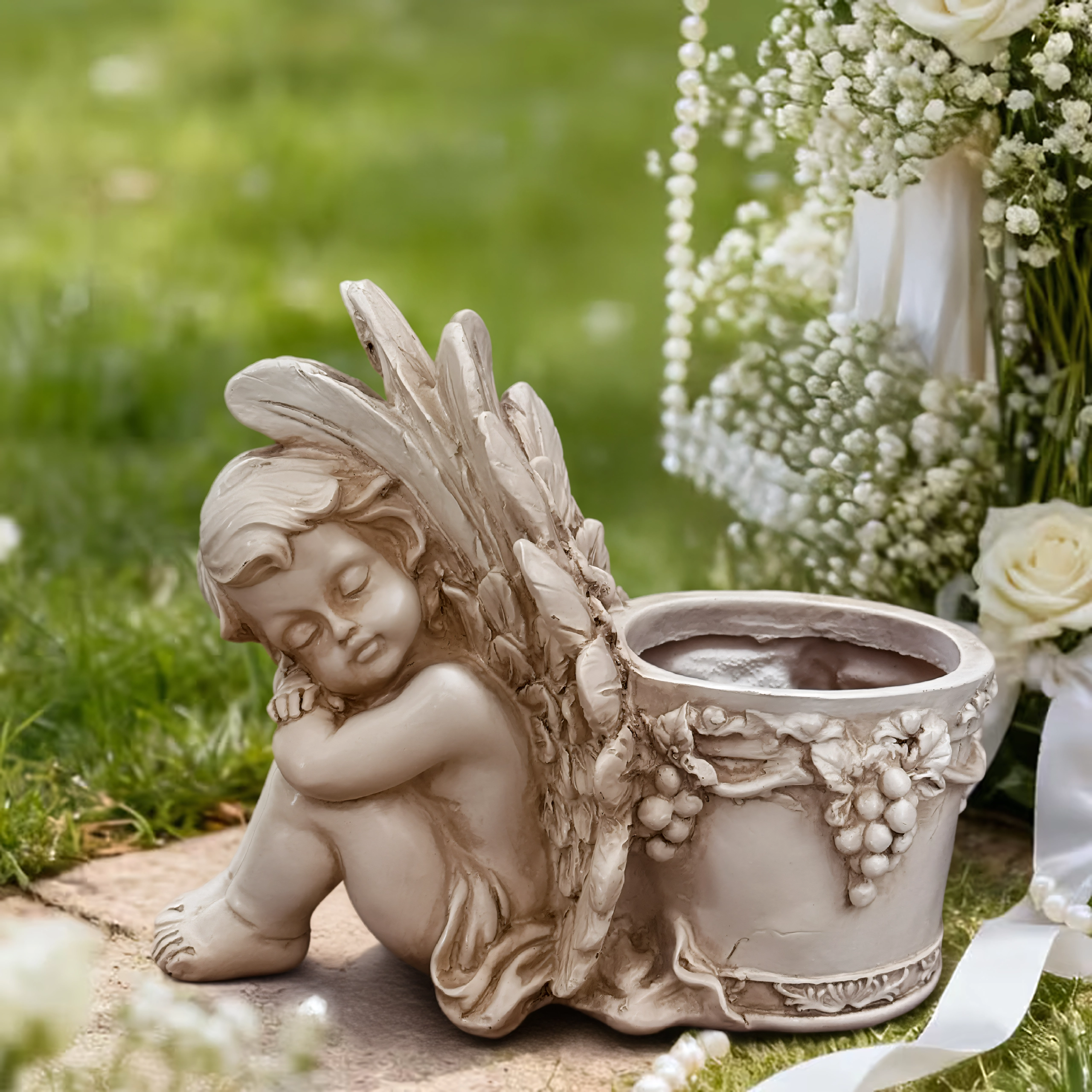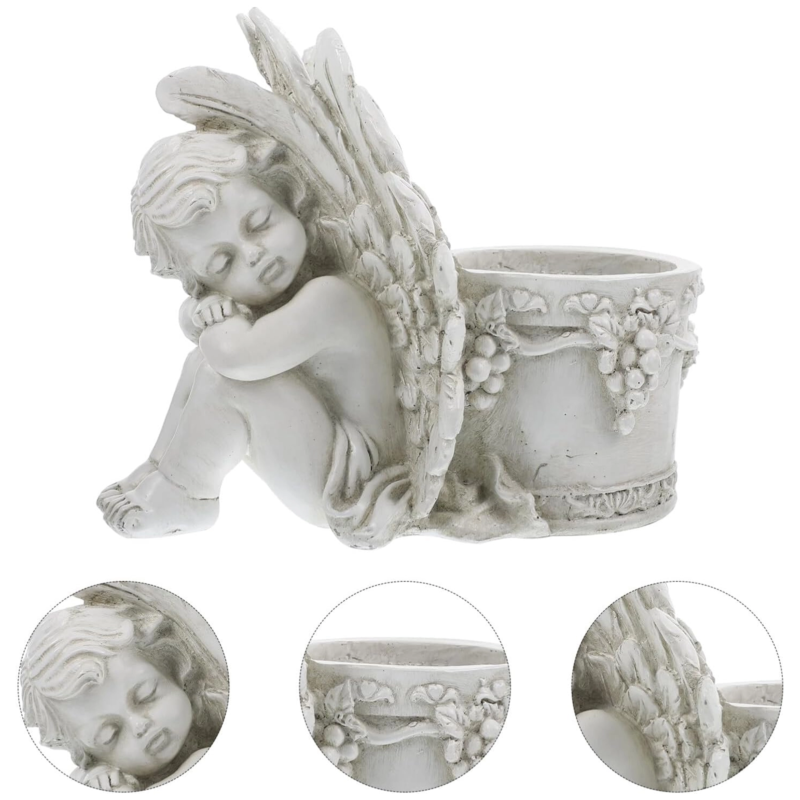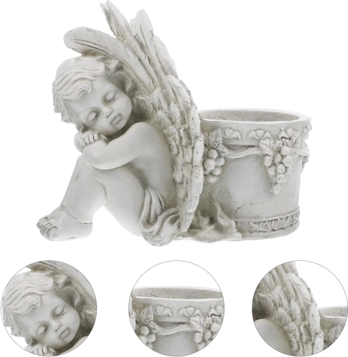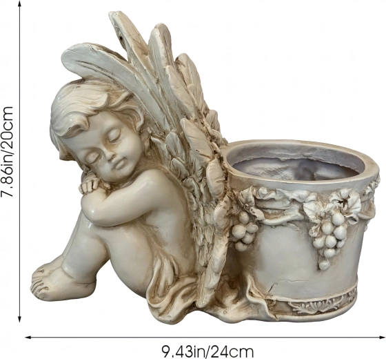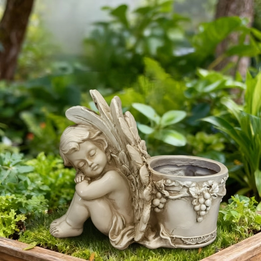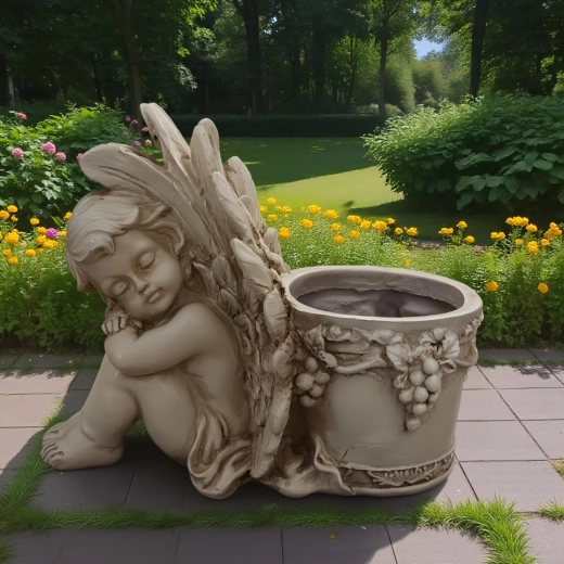 Elegant dekorativ blomsterkrukke med motiv af en sovende engel, der gør sig smukt både i haven og derhjemme. Den byder på detaljeret reliefarbejde, vintage stenlook og praktisk plads til planter eller et lys. Ideel som romantisk havedekoration, til urter og sukkulenter samt som gavearrangement.