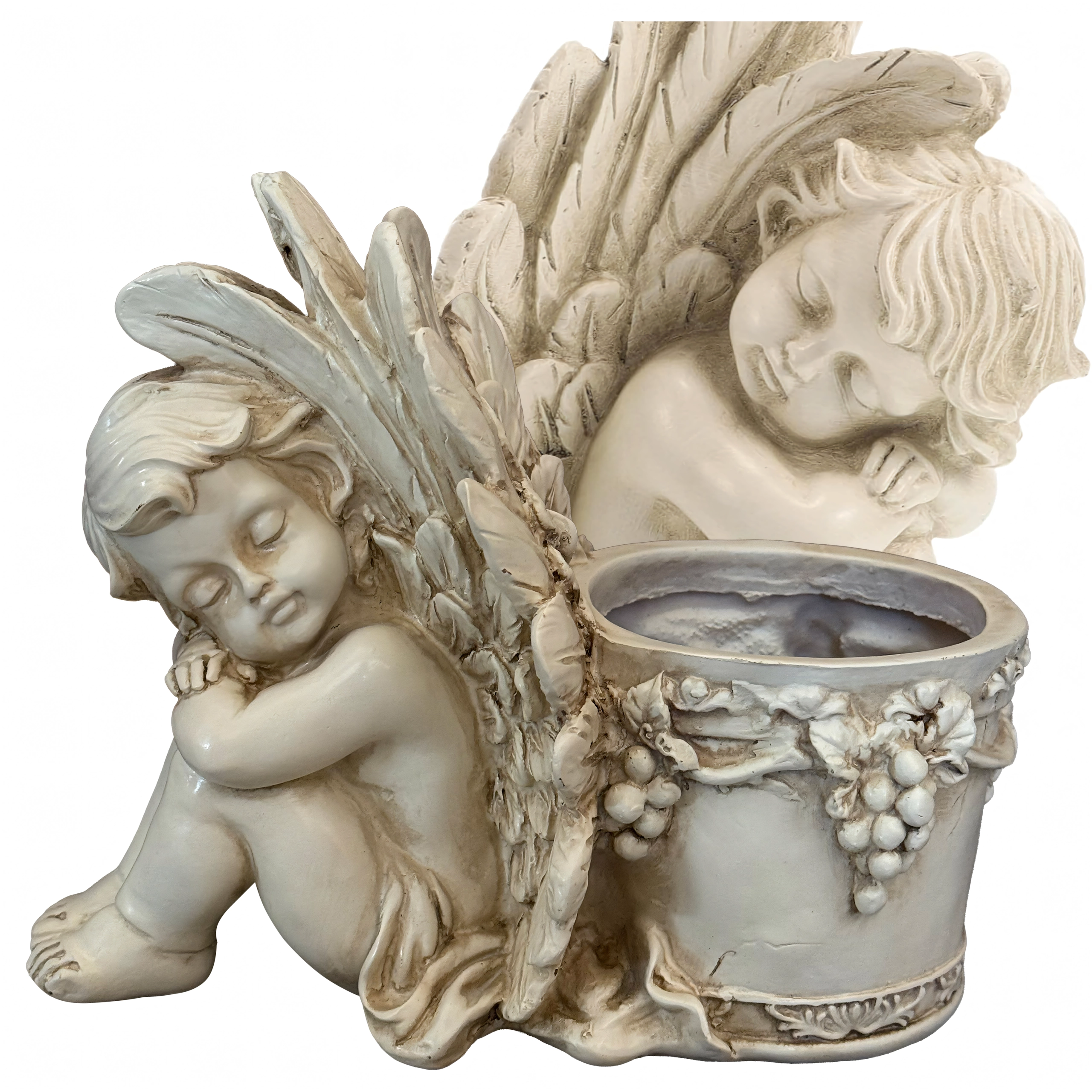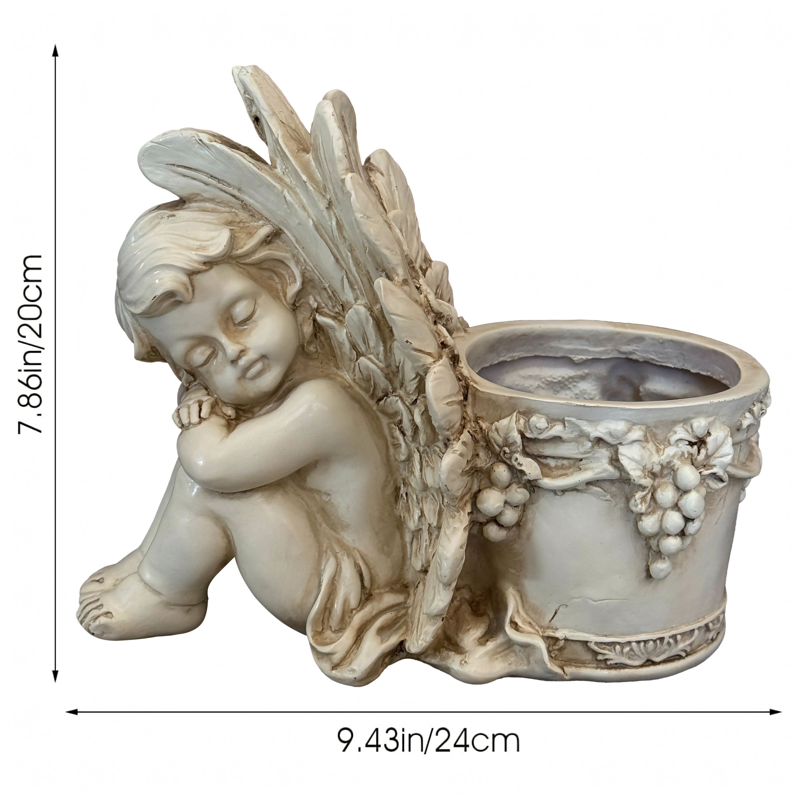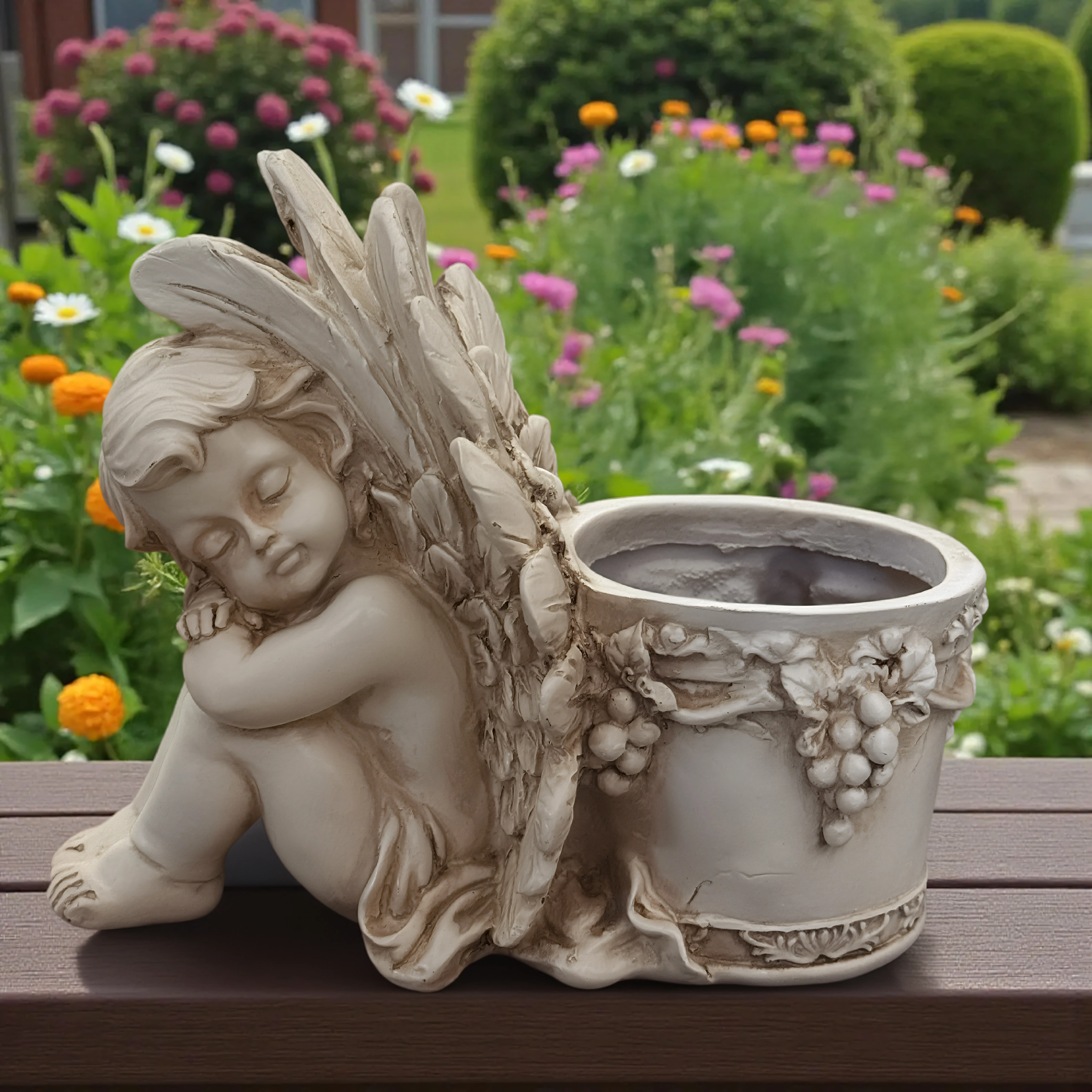 Elegant dekorativ blomsterkrukke med motiv af en sovende engel, der gør sig smukt både i haven og derhjemme. Den byder på detaljeret reliefarbejde, vintage stenlook og praktisk plads til planter eller et lys. Ideel som romantisk havedekoration, til urter og sukkulenter samt som gavearrangement.