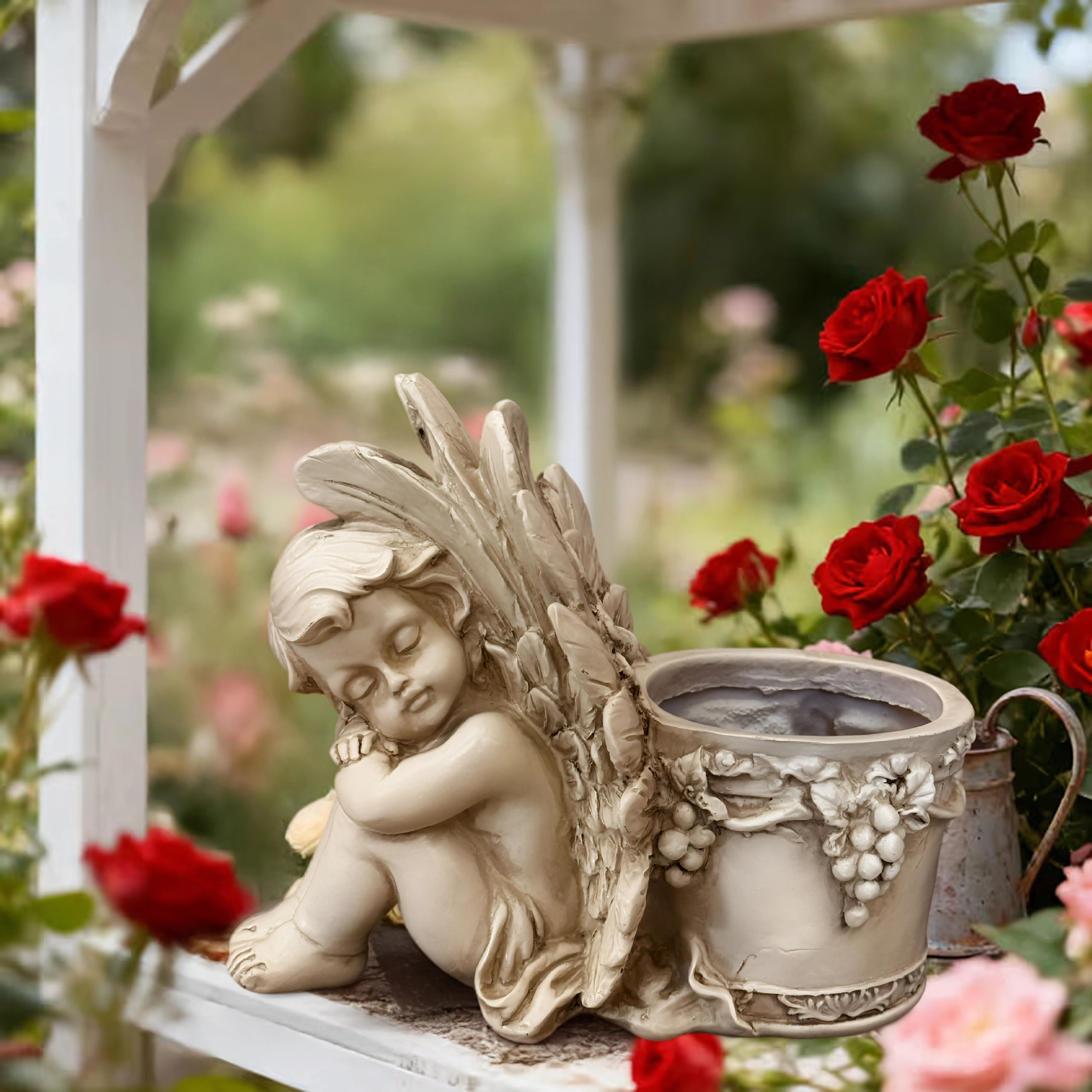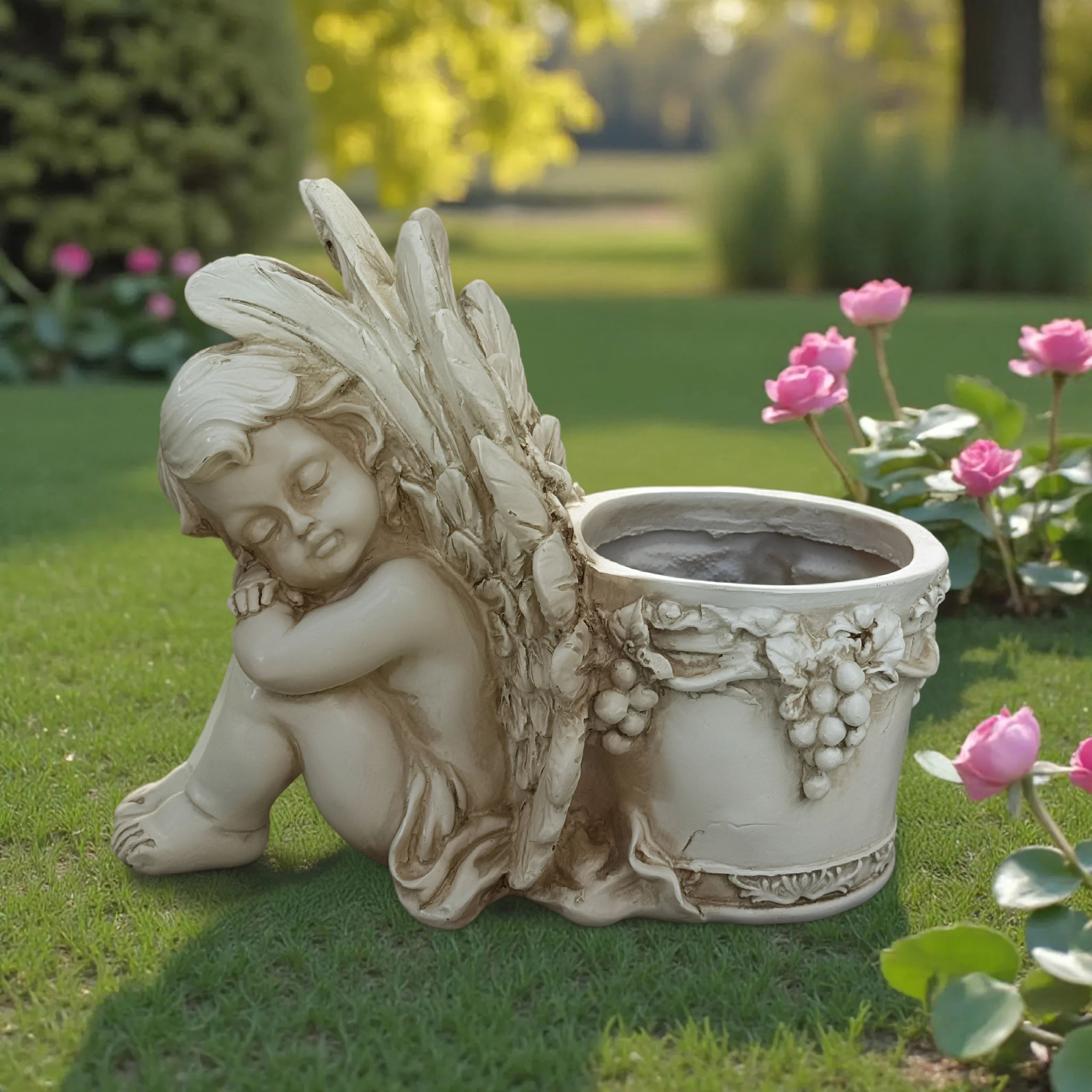 - Dekorativ blomsterkrukke med engleskulptur