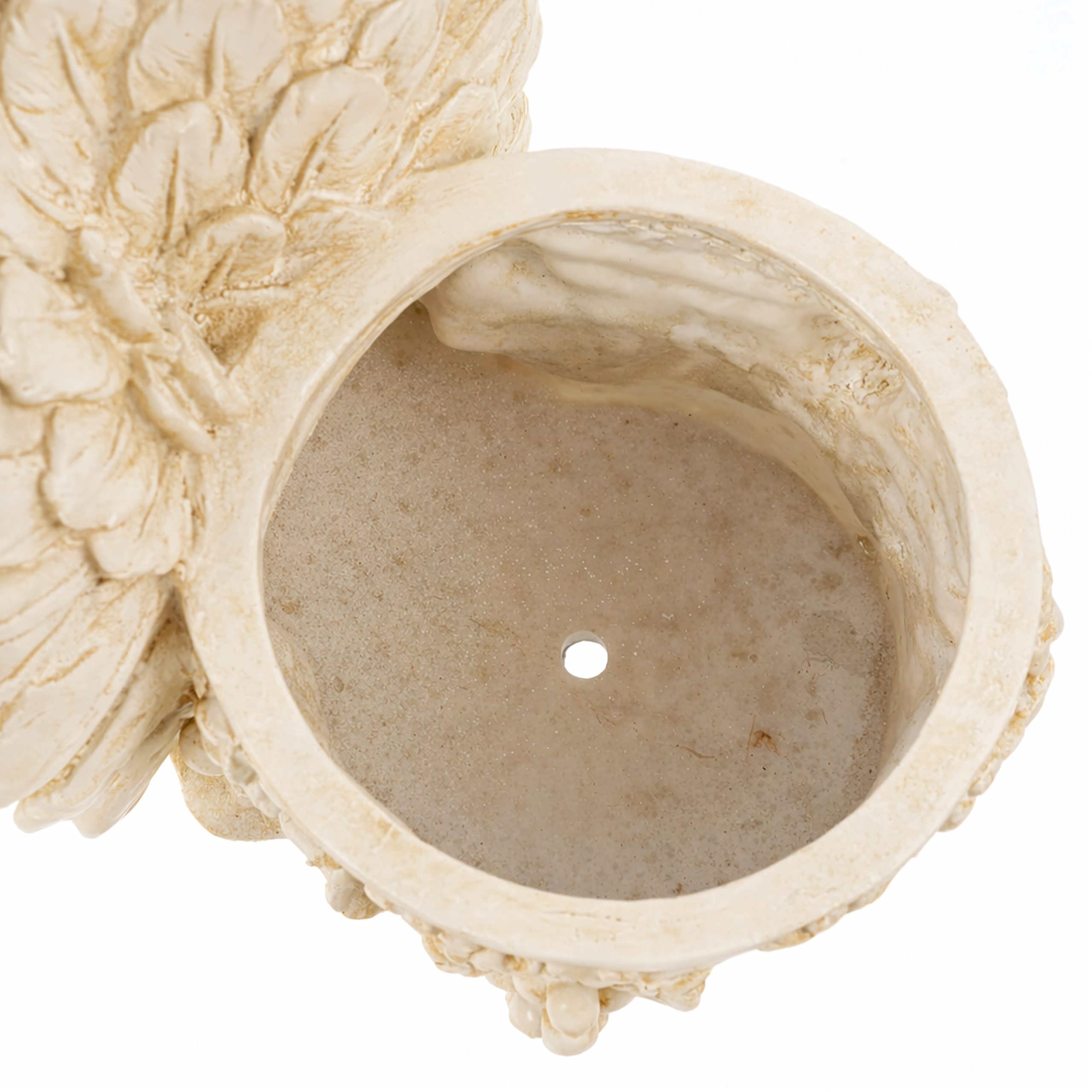 Præcise detaljer på vinger, hår og bladværk giver dekorationen en autentisk, stenlignende karakter, der skiller sig ud i enhver opsætning.