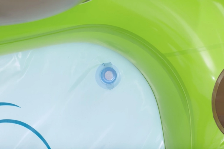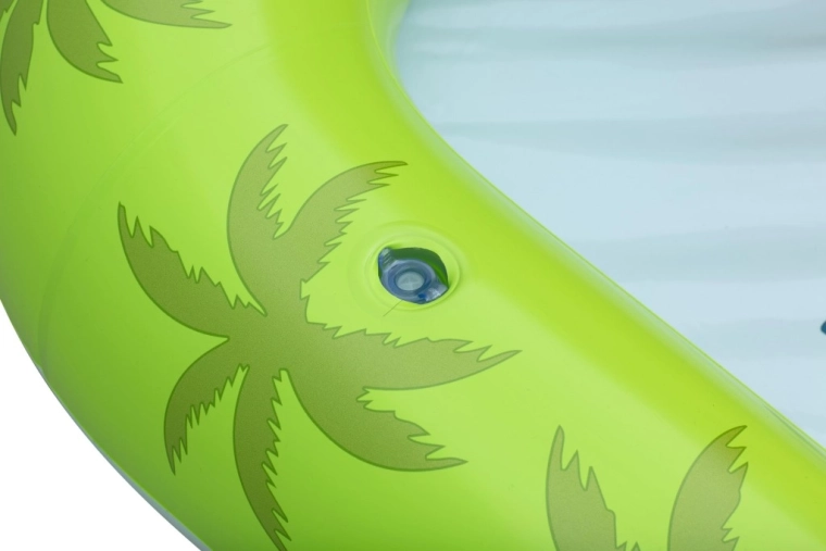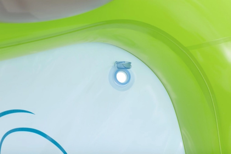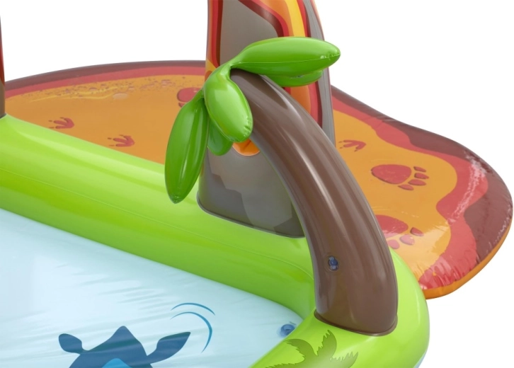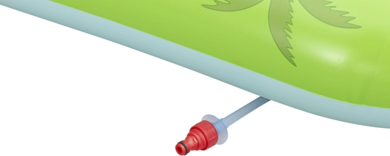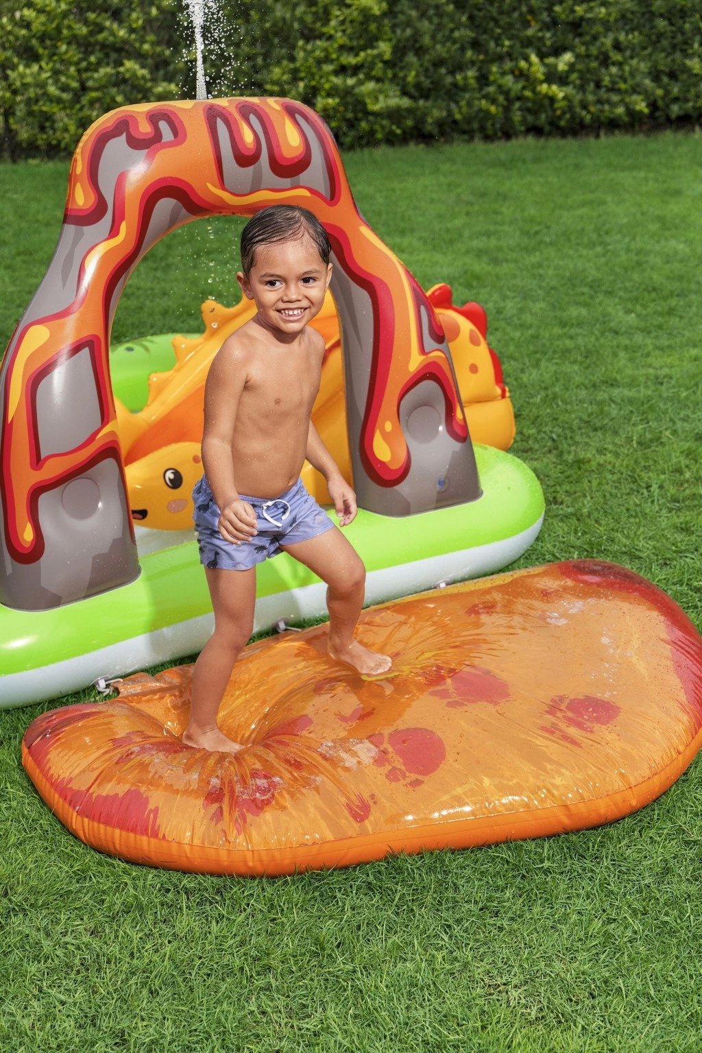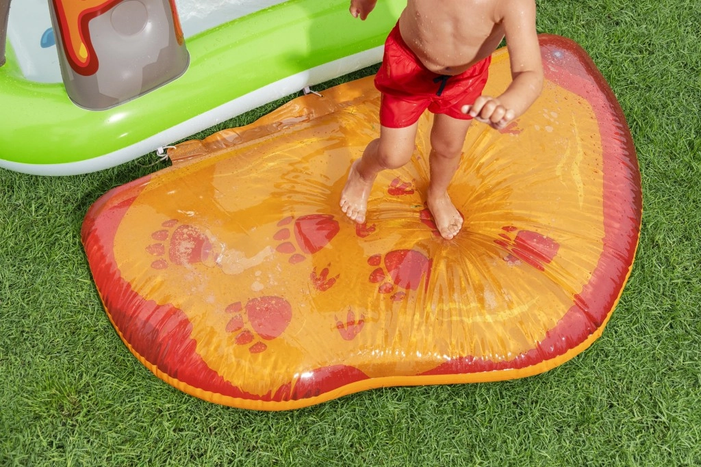 Det oppustelige legetræningscenter med dinosaurer er et ideelt valg til aktiv sommersjov for børn fra 2 år. Den grønne pool med palmeprint og blå bund rummer ca. 150 l vand, mens den separate vandmåtte med lavatema tilføjer yderligere 80 l for en blød landing og sjov trampen. Den integrerede spreder på vulkanbuen tilsluttes nemt til haveslangen og skaber på få øjeblikke en forfriskende bruse.