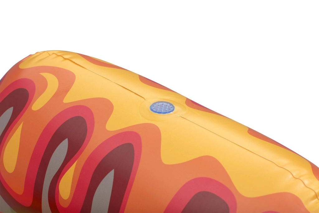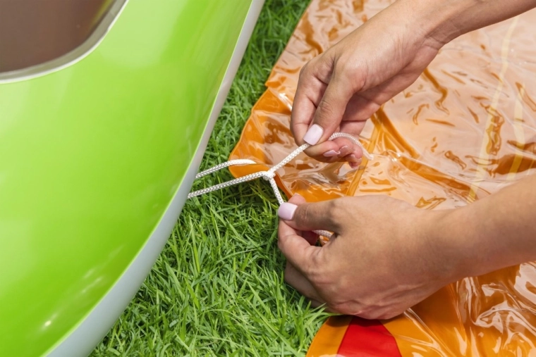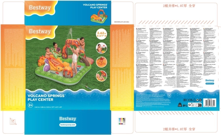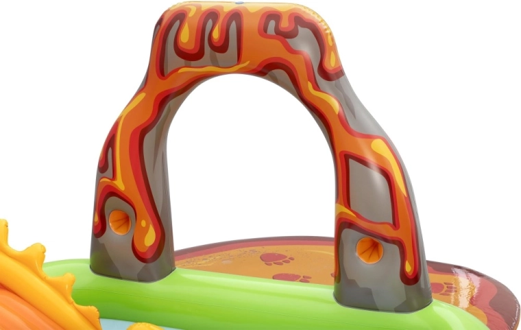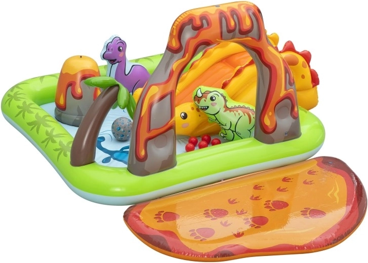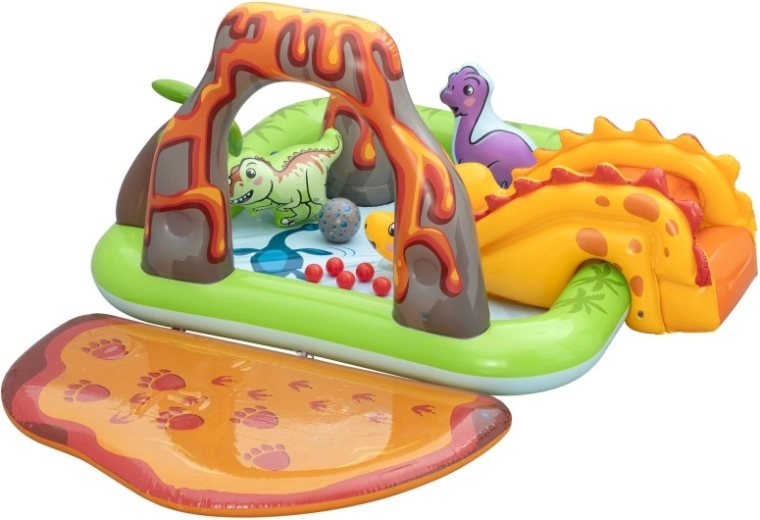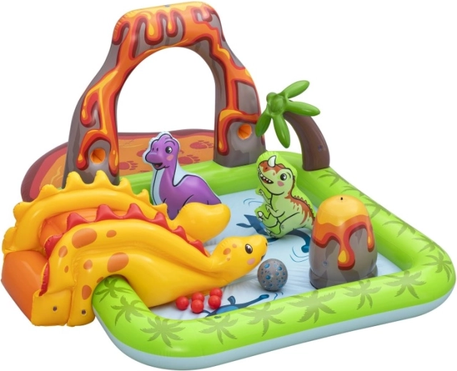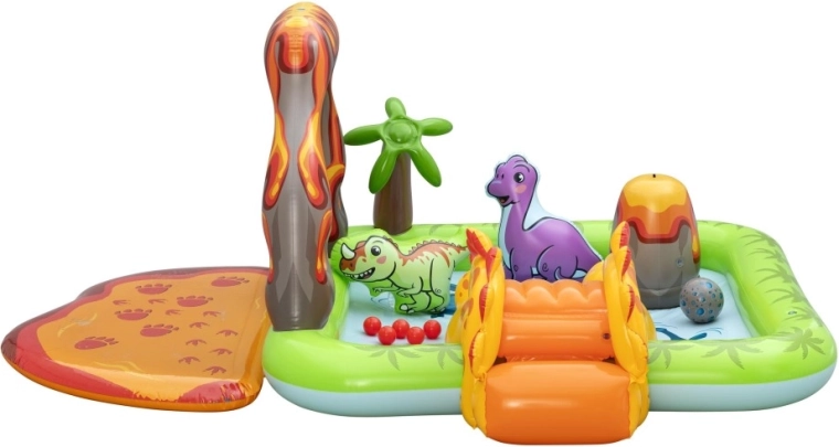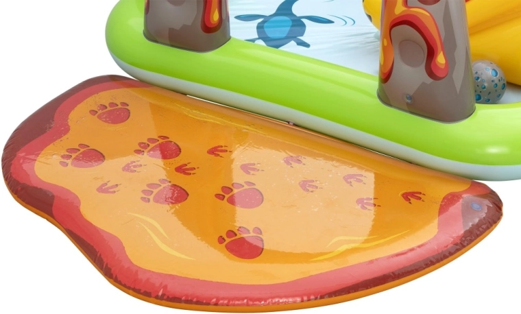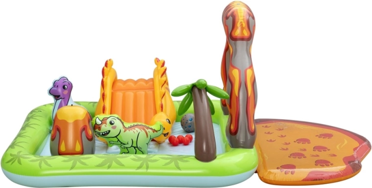 Sættet indeholder en gul dinosaur med rutsjebane, oppustelige grøn og lilla dinosaur som legefigurer, en åbning i “vulkanen” til boldkast samt en blød landingspude for sikker nedbremsning. Takket være kvalitetsvinyl, glatte sømme og afrundede kanter er legen både behagelig og sikker. Hurtig oppustning, nem tømning og en medfølgende reparationslap gør vedligeholdelse og opbevaring let.