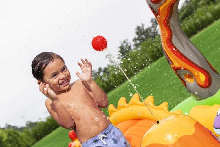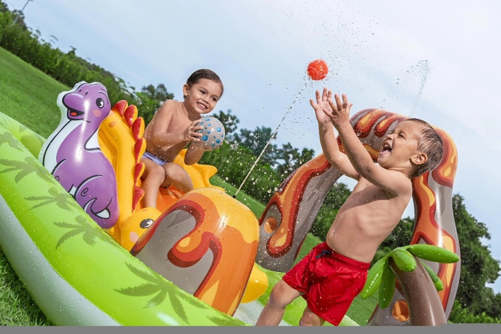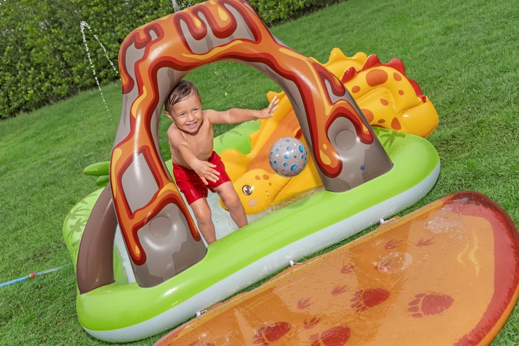 Kast bolde gennem vulkanåbningen, udforsk dinosaurfigurerne, og styrk fantasi og motorik med legende vandaktiviteter.