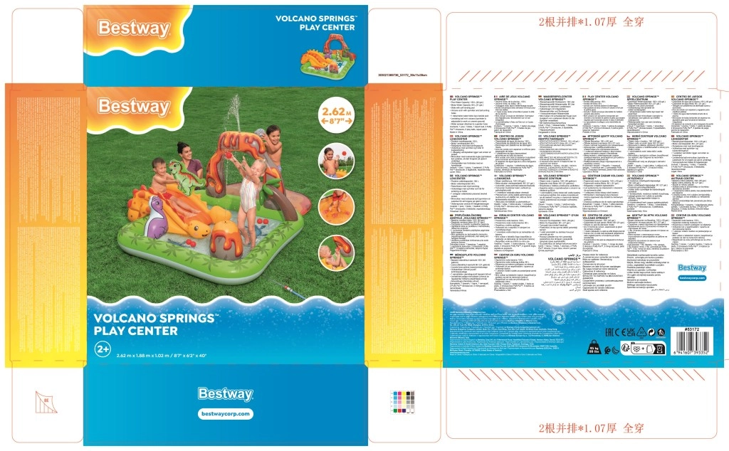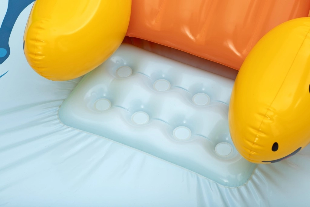 Kickstart sommeren med dette farverige oppustelige legetræningscenter med dinosaurtema, som forvandler enhver have til en lille vandpark. Det byder på en rummelig soppepool 262 × 188 × 102 cm, en blød rutsjebane med landingspude og en vandspreder, der kan tilsluttes haveslangen. Børn vil elske dinosaurfigurer, en vulkanbue med kaståbning til bolde og en vandmåtte for endnu mere sjov med plask. Holdbart vinyl sikrer tryg og langvarig leg selv ved hyppig brug.