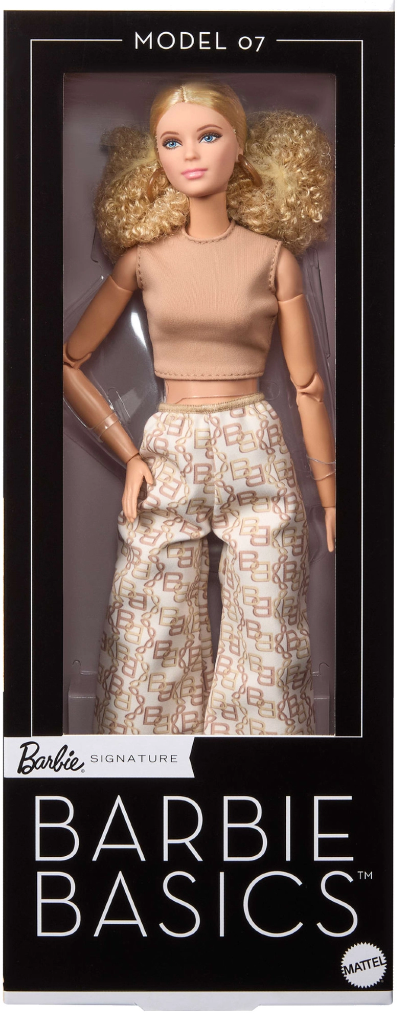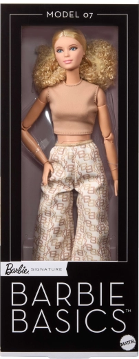 BARBIE Signature Basics Model 07 hylder minimalisme og moderne elegance. Det fine ansigt med blå øjne, delikat makeup og lys hudtone fremhæver hendes klassiske skønhed. Blondt krøllet hår er stylet i en enkel frisure, der matcher seriens rene æstetik.