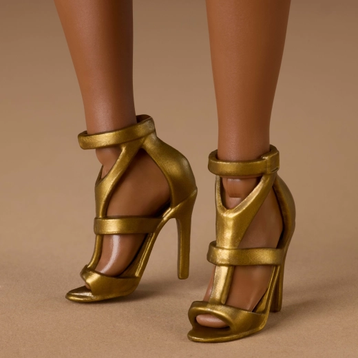 Stilen er afstemt i neutrale og tidløse toner med gyldne accenter – en glitrende gylden kjole komplementeres af diskret makeup og fine detaljer. Dukken er kompatibel med BARBIE-tilbehør og passer perfekt til kreative outfits og stilblanding.